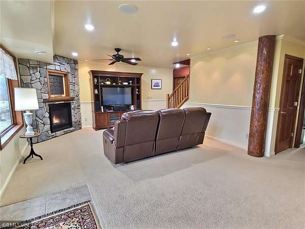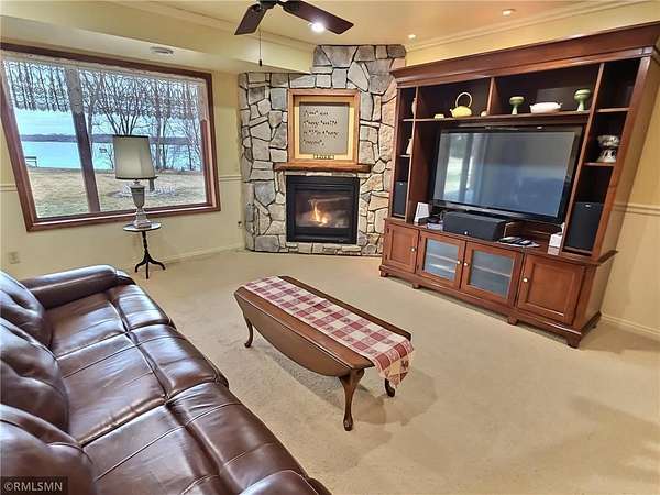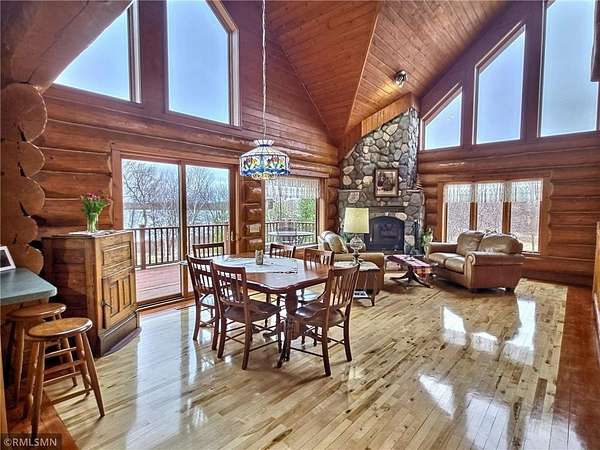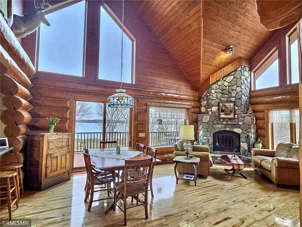 Maple border and sunlight pouring through all of the grand windows that overlook the lake. A striking floor-to-ceiling stone, wood-burning fireplace anchors the