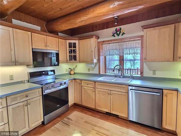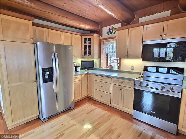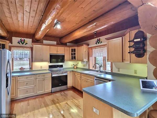 Living area, making it the perfect gathering space in every season. The log archway welcomes you into the kitchen that offers quality, hard maple cabinetry, brand new SS appliances,