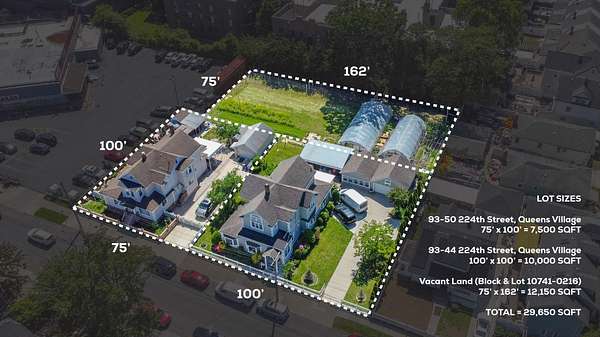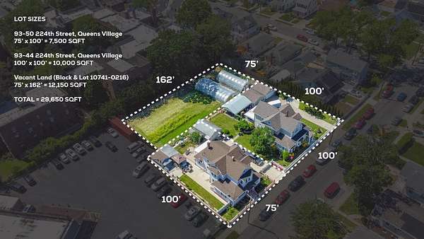 Address & Land: 93-44 224th St, Queens Village (100 x 100 Ft Lot) ; 93-50 224th St, (75 x 100 Ft Lot) and Vacant Land (Block & Lot 10741-0216) 75x162 Ft. Lot.