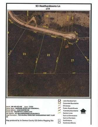 Very private and quiet area on a hidden cul-de-sac. Wonderful building site with long vistas of the Shenandoah Valley, the Elizabeth lights at night and the Berlage farm. Numerous mature hardwoods on the property and very close to the Eagle Ridge General Golf Course. This is the location to build that "Rocky Mountain" home on the hill. Sale subject to GTA document transfer fee. Ownership in The Galena Territory Association (GTA) includes: Owners' Club with indoor and outdoor pools, fitness facility, outdoor tennis, multi-sport gym and game room. Lake Galena and the Marina Complex, The Shenandoah Riding Center along with the 24-mile Trail System and Greenspace provide over 1,900 acres of year-round outdoor recreation with 24/7 Security Patrol and all of this is just a short drive to the restaurants, championship golf, and spa facilities of Eagle Ridge Resort & Spa on the GTA grounds.
