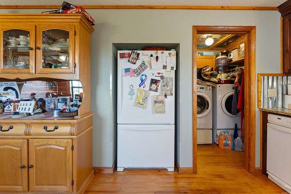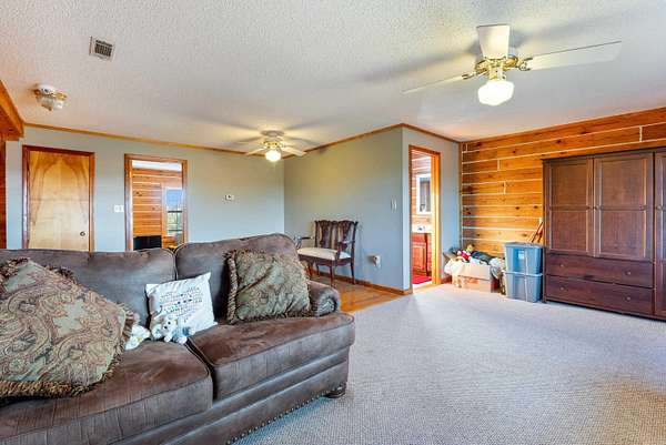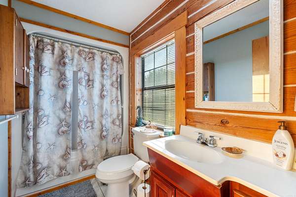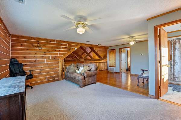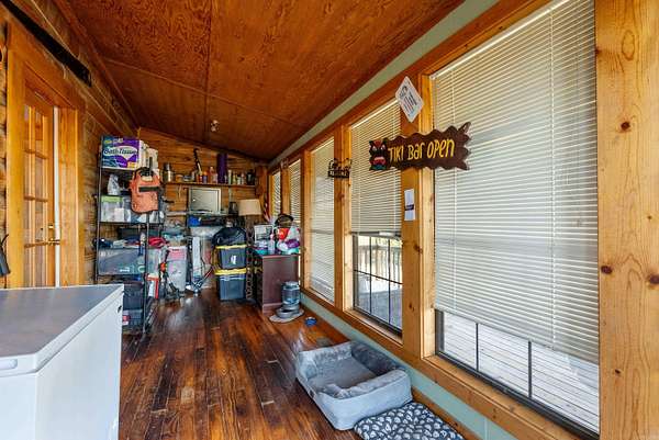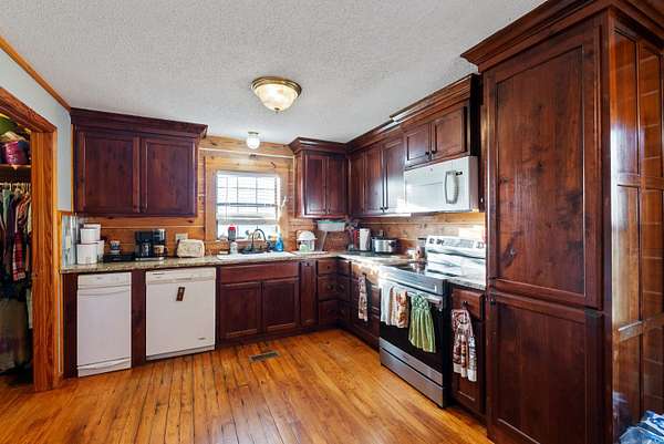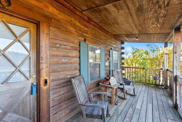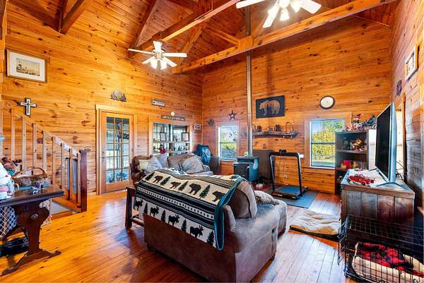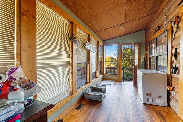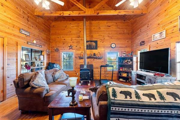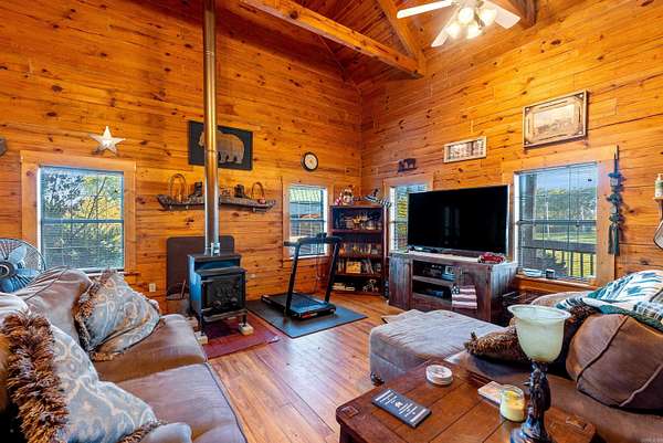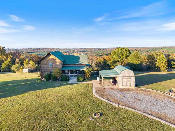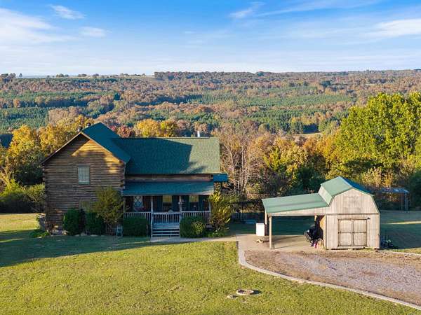 Log home on 4.18 wooded acres in Mill Creek Estates, offering privacy and country living just minutes from Greenbrier. This rustic property features vaulted exposed-beam ceilings, a wood-burning stove, and the warmth of natural wood throughout. The spacious kitchen includes cherry cabinetry, granite countertops, and mixed appliances -- a stainless range with white refrigerator, dishwasher, and trash compactor. A large covered back porch and sunroom provide relaxing spaces to enjoy the views and surrounding nature. The home also includes a bonus room and a recently added 1-car carport with attached storage shed. With its peaceful setting, generous acreage, and plenty of potential, this property offers a solid opportunity to restore and personalize a true log home in a desirable area.