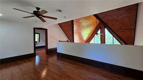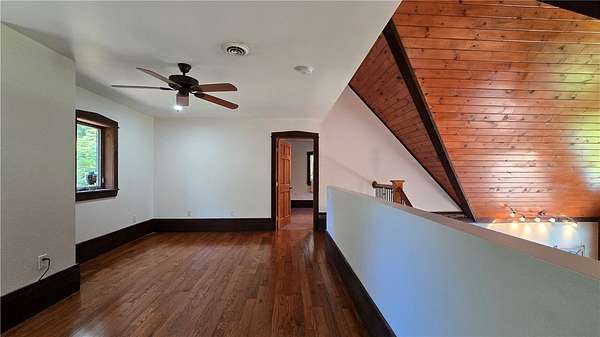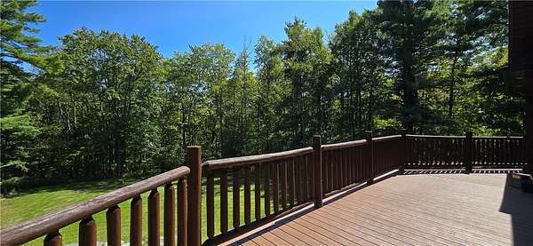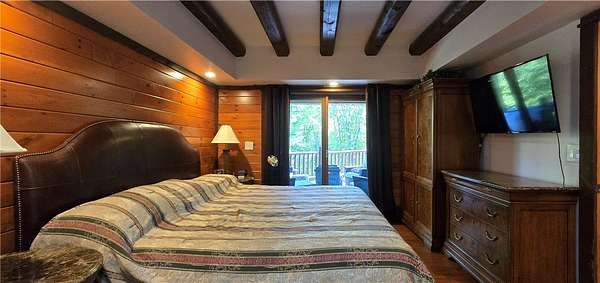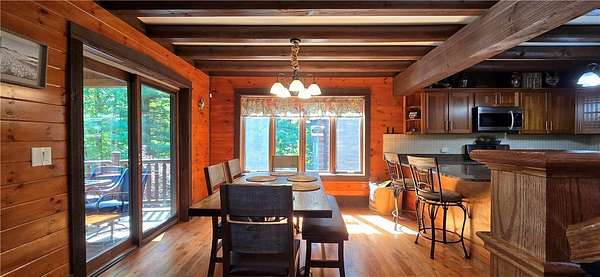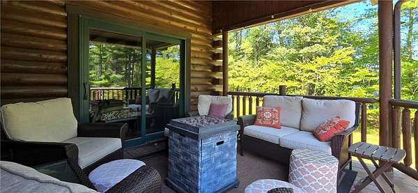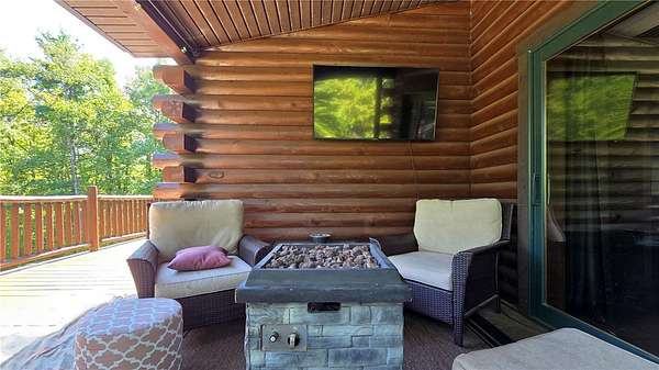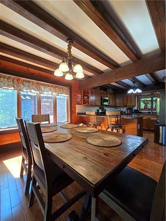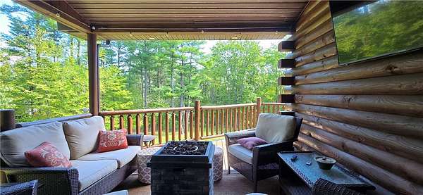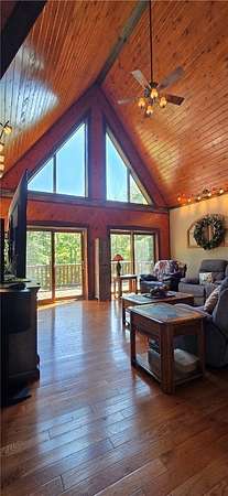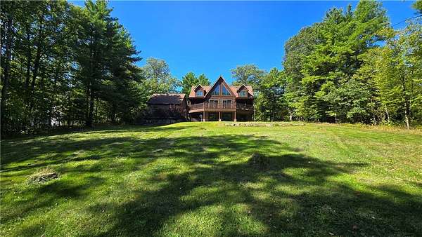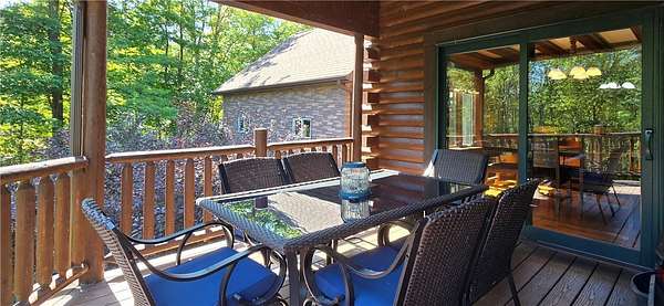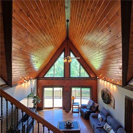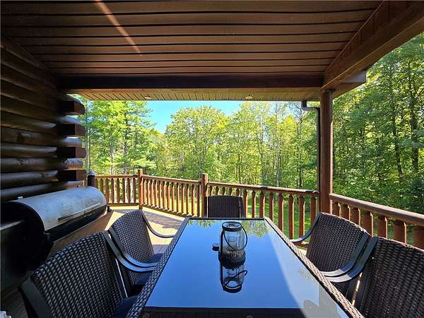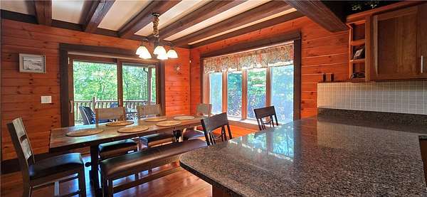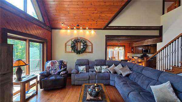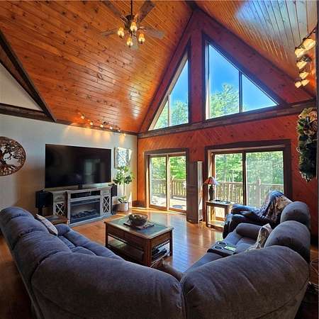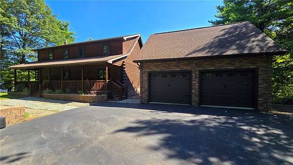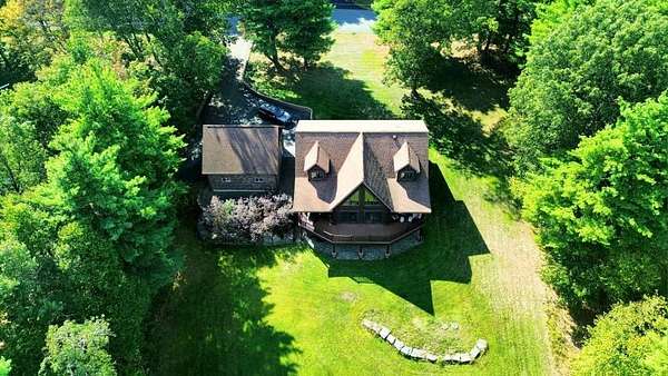 Welcome to this stunning log cabin chalet nestled on 5.86 acres of peaceful countryside. This beautifully crafted home combines rustic charm with modern amenities, offering a warm and inviting retreat for both everyday living and entertaining. From the moment you arrive, the cozy front porch sets the tone for the comfort and character found throughout the property. Inside, the main floor features a spacious master bedroom suite with private access to the wraparound deck-perfect for morning coffee or evening relaxation. The living room boasts soaring cathedral ceilings that flood the space with natural light, creating a dramatic yet cozy atmosphere. Adjacent to the living room, the dining area opens directly onto the expansive back deck, which wraps around to the master suite. This outdoor space is ideal for hosting gatherings, enjoying nature, or simply unwinding in privacy. A convenient half bath completes the main level. Upstairs, you'll find a comfortable guest suite along with one additional bedroom, offering a cozy and private retreat for visitors or family members. The layout is thoughtfully designed to provide separation from the main living areas, making it ideal for hosting overnight guests or creating a quiet space for relaxation. The lower level adds even more versatility, featuring a walk-out family room that opens to the backyard, a fourth bedroom, a full bathroom, and a dedicated office space-perfect for remote work, creative projects, or a quiet study. Whether you're hosting movie nights, working from home, or welcoming guests, this level offers endless possibilities. Additional highlights include forced air heating and central air conditioning for year-round comfort, and a two-car garage with ample storage. With a total of four bedrooms and three and a half baths, this home is as functional as it is beautiful.