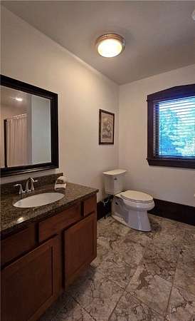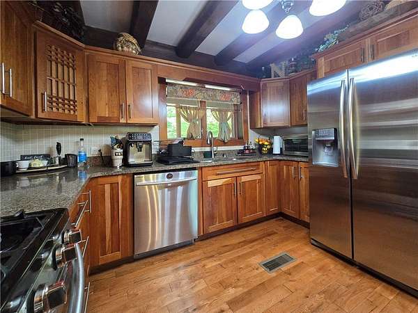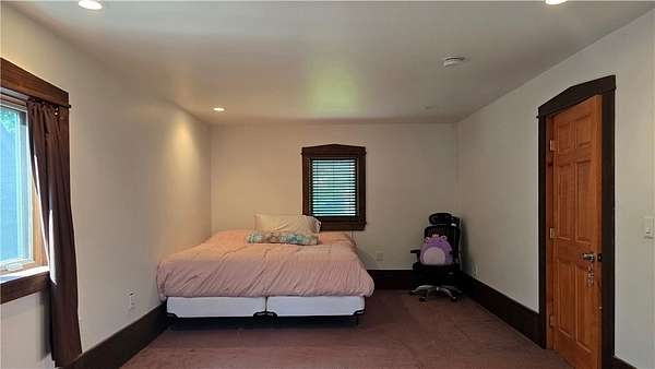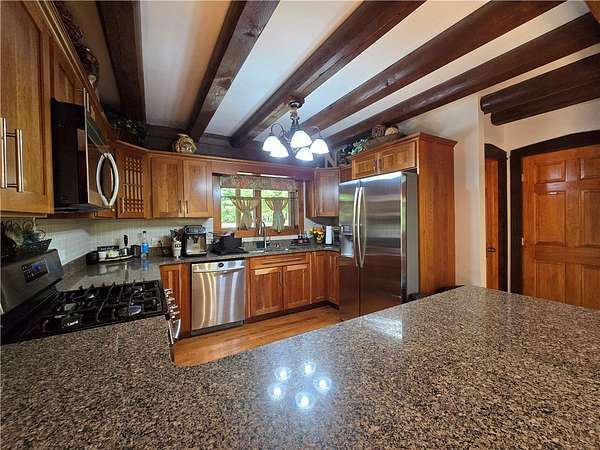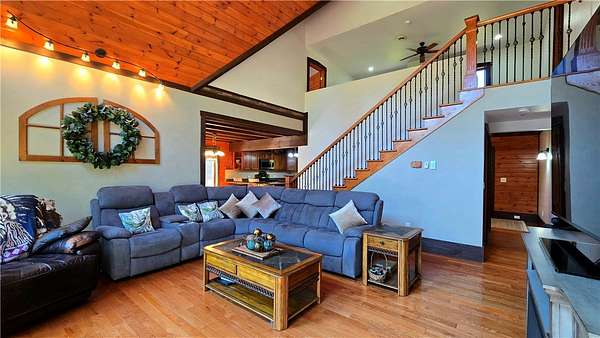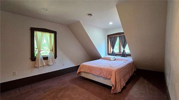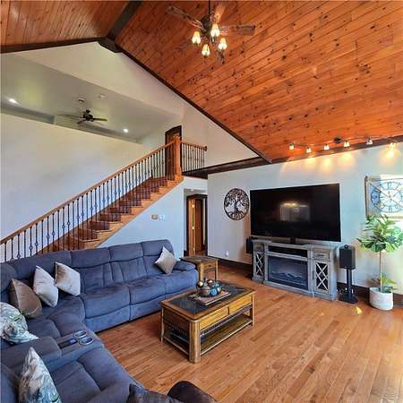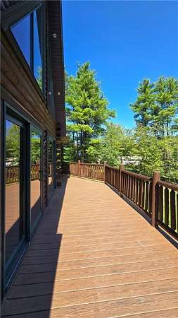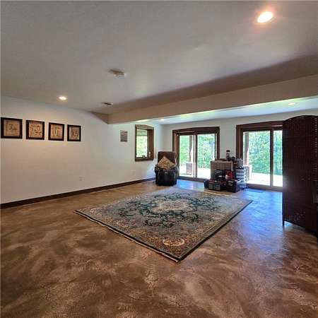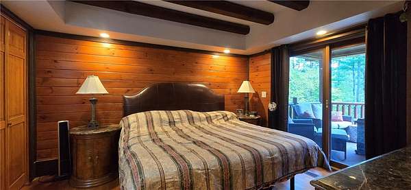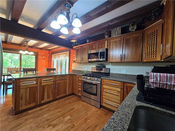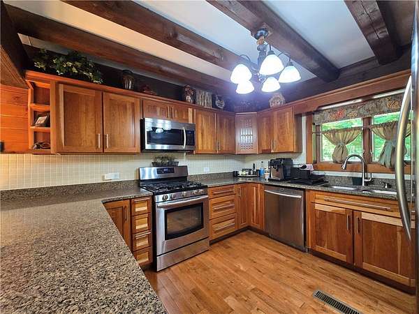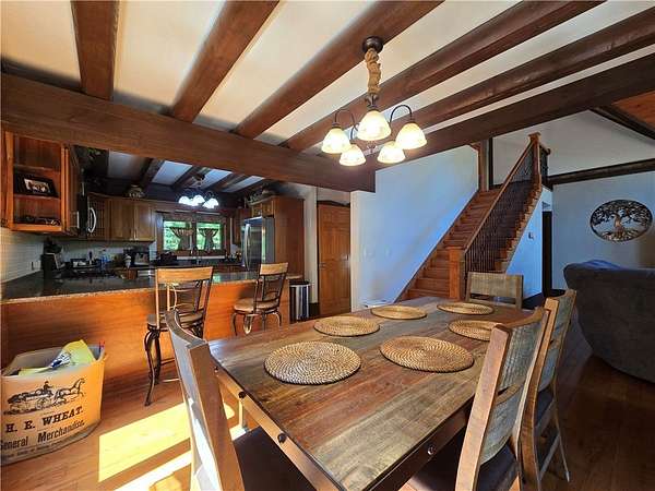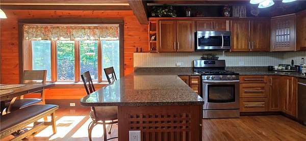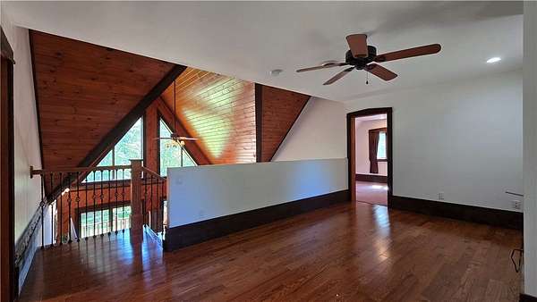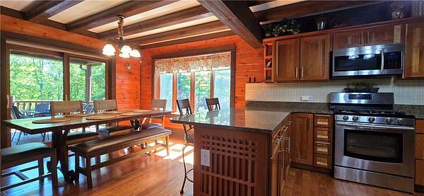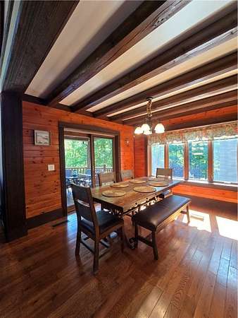 Welcome to this stunning log cabin chalet nestled on 5.86 acres of peaceful countryside. This beautifully crafted home combines rustic charm with modern amenities, offering a warm and inviting retreat for both everyday living and entertaining. From the moment you arrive, the cozy front porch sets the tone for the comfort and character found throughout the property. Inside, the main floor features a spacious master bedroom suite with private access to the wraparound deck-perfect for morning coffee or evening relaxation. The living room boasts soaring cathedral ceilings that flood the space with natural light, creating a dramatic yet cozy atmosphere. Adjacent to the living room, the dining area opens directly onto the expansive back deck, which wraps around to the master suite. This outdoor space is ideal for hosting gatherings, enjoying nature, or simply unwinding in privacy. A convenient half bath completes the main level. Upstairs, you'll find a comfortable guest suite along with one additional bedroom, offering a cozy and private retreat for visitors or family members. The layout is thoughtfully designed to provide separation from the main living areas, making it ideal for hosting overnight guests or creating a quiet space for relaxation. The lower level adds even more versatility, featuring a walk-out family room that opens to the backyard, a fourth bedroom, a full bathroom, and a dedicated office space-perfect for remote work, creative projects, or a quiet study. Whether you're hosting movie nights, working from home, or welcoming guests, this level offers endless possibilities. Additional highlights include forced air heating and central air conditioning for year-round comfort, and a two-car garage with ample storage. With a total of four bedrooms and three and a half baths, this home is as functional as it is beautiful.