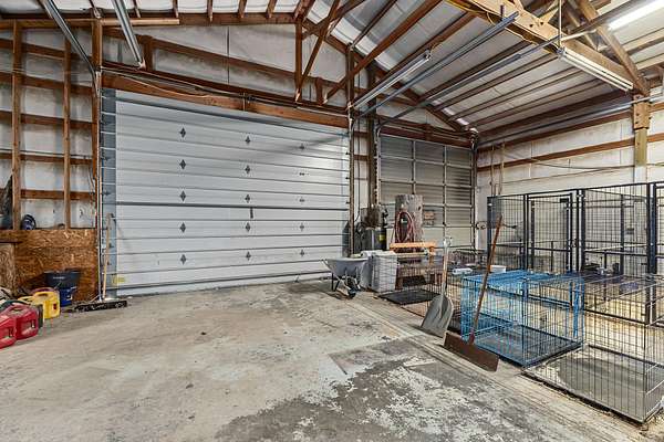 The horse facilities are set up right: a 270' x 140' outdoor arena with roping boxes and attached cattle runs, seven horse turnouts with shelters, water, and power in six of them, and a round pen for training and groundwork. Supporting structures include a large 2-bay, 4,440+- square foot shop with office space and tack room, a spacious "cover-all" hay barn, an equipment shed, and a calving shed with well-laid-out, cross-fenced pastures for livestock management.