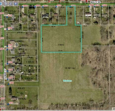 From Windham, take OH-303 to North Main Street. Property is located at 9300 N Main St, on the east side of the road. Look for the paved entrance. Property spans approximately 21.38 acres.