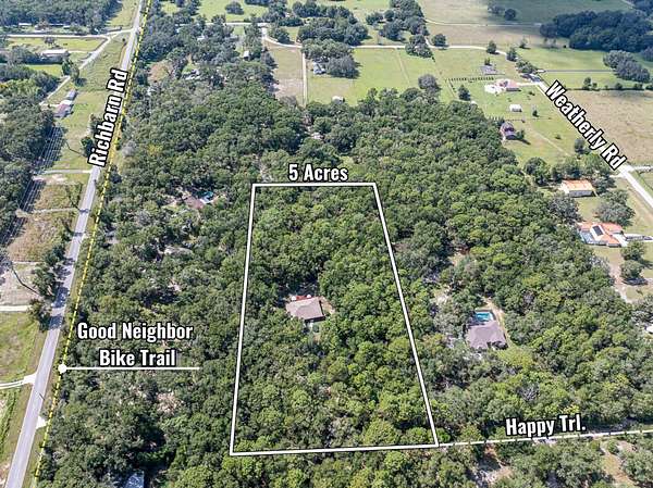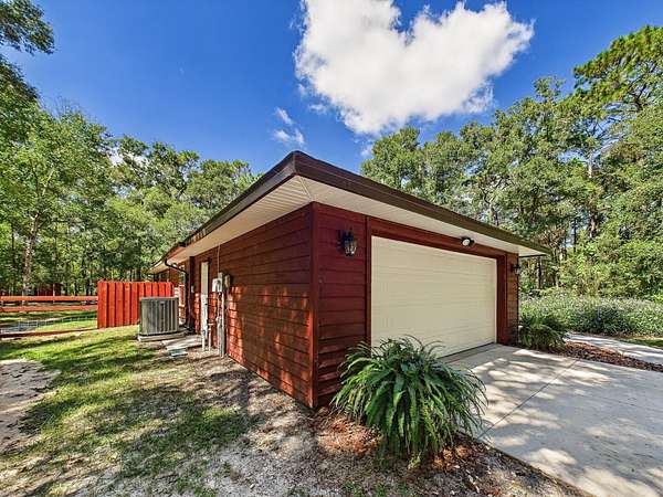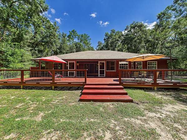 Move-in ready 3-bedroom, 2-bath home on 5 private, fully fenced acres. Located on a quiet, dead-end road shared with only three other homes, this 5-acre property provides privacy and ample space. No HOA or deed restrictions and zoned AG. The home features an open floor plan with a large living area, dining space, and kitchen. The split-bedroom layout provides a private owner's suite with a walk-in closet and full bath. Two additional bedrooms and a second full bath are located on the opposite side of the home. The large deck and screened porch are ideal for entertaining. Exterior improvements include a 704 sq. ft. wooden deck (installed 2021, freshly stained 2025), new screened-in porch (2025), concrete sidewalks and garage pad (2021), new architectural shingle roof (2021), exterior paint (2021), and updated well plumbing and tank (2024). The pole building on the property could make a great workshop or a large space for additional storage. Enjoy quiet country living just 10 minutes from downtown Brooksville and direct access to the Good Neighbor Trail. The Withlacoochee State Forest and Weeki Wachee Springs are both nearby, offering more opportunities for outdoor recreation. Do not miss this rare opportunity to own a well-kept rural home offering space, privacy, and convenience -- all in one property.