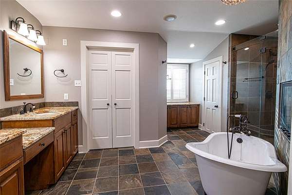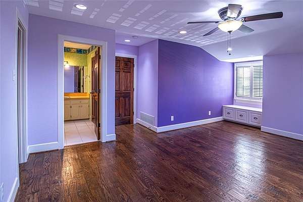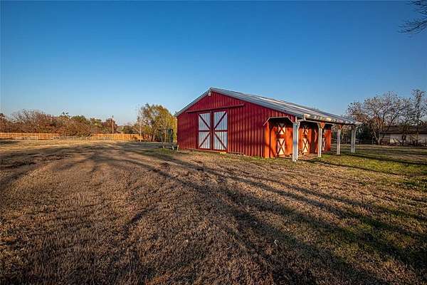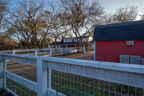 Ranchette in Rowlett ready for your farm animals all on 2.83 acres! This Gambrel-roof Colonial that's blended with classic Texas ranch elements with circular drive has a great floorplan for your family including multi-generational. So much original charm from the 1960's plus many modern updates. Three ensuite bedrooms with two of them primary suites: one upstairs and one down. The main suite has been completely updated with Spa-like bath featuring a cozy double-sided fireplace next to a deep soaking tub, set against a slate accent wall and matching slate floors. Separate his-and-her closets and dual vanities and with granite counters, plus plenty of storage and getting-ready space. A crystal-style light fixture and charming round window add natural light and a touch of rustic elegance. Secondary suite is perfect for inlaws or teens. Third bedroom has fun vintage flared bathroom. Warm farmhouse-style kitchen with custom cream cabinetry, glass-front uppers, and vintage-inspired plate rack, all accented by a stacked-stone backsplash and rich granite counters. The wood-planked island with cooktop and striking custom vent hood offers additional prep space, and feels like the heart of the home, perfect for canning days or big family gatherings. Stainless steel appliances.