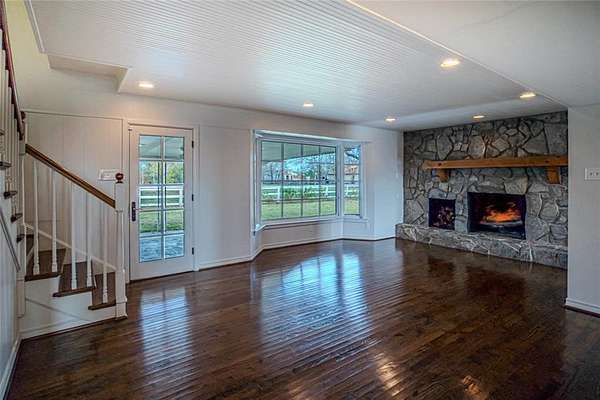 Throughout this home you will find hardwood floors, beadboard ceilings, recessed lighting, walls of windows bringing the scenic pasture views right in. Discover the oversized rooms throughout with options of dividing spaces up if more rooms are needed. Huge walk in closets in all bedrooms. Study with builtins. Living room features a stone wood burning fireplace and appealing staircase. Family room is spacious, includes a wet bar, and is great for gatherings. 3 full baths, 1 half. Outdoors is just as amazing! The barn has 4 stalls with Dutch doors, office space, room for hay and tack. Swimming pool with rock water feature + stone walkway. Gardening areas. Pond in the back. Variety of mature trees.