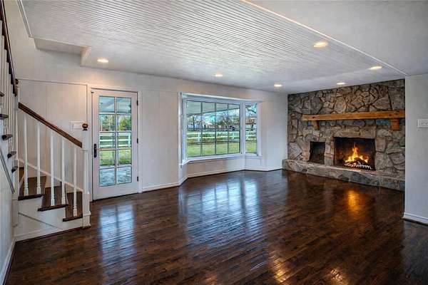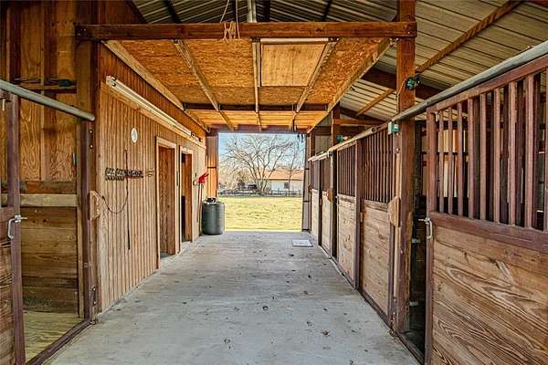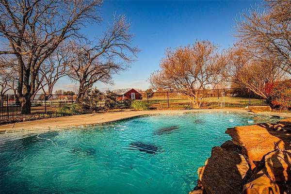 Ranchette in Rowlett ready for your farm animals all on 2.83 acres and super close to Dallas! The barn has 4 stalls, office space, room for hay and tack. Pond in back. Swimming pool with rock water feature + stone walkway. Gardening areas. Storage shed. Variety of mature trees incl. pecan. The Gambrel-roof Colonial that's blended with classic Texas ranch elements with circular drive has a great floorplan for your family including multi-generational. 3 bed, 3.1 bath, over 3500 sq ft. So much original charm from the 1960's plus many modern updates. 3 ensuite bedrooms- two upstairs and one down. The main suite has been completely updated with Spa-like bath featuring a double-sided fireplace next to a deep soaking tub sitting on slate floors. Separate his-and-her closets and dual vanities and with granite counters, plus plenty of storage. A crystal-style light fixture and charming round window add natural light and a touch of rustic elegance. Secondary suite is perfect for inlaws or teens. Third ensuite bedroom has fun vintage flared bathroom. Warm farmhouse-style kitchen with custom cream cabinetry, glass-front uppers, and vintage-inspired plate rack, all accented by a stacked-stone backsplash and rich granite counters. The wood-planked island with cooktop and striking custom vent hood offers additional prep space, and feels like the heart of the home, perfect for canning days or big family gatherings. Stainless steel appliances. Throughout this home you will find hardwood floors, beadboard ceilings, recessed lighting, walls of windows bringing the scenic pasture views right in. Discover the oversized rooms throughout with options of dividing spaces up if more rooms are needed. Huge walk in closets in all bedrooms. Study with builtins. Living room features a stone wood burning fireplace and appealing staircase. Family room is spacious, includes a wet bar, and is great for gatherings. Extra-large dining room plus breakfast nook. Don't miss this one of a kind home!