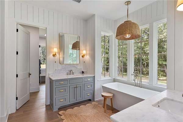 Constructed with James Hardie siding, Pella windows, solid wood doors, and spray foam insulation, the home features geothermal heating and cooling for year-round energy savings. The welcoming front porch with a suspended daybed is perfect for morning coffee overlooking lush green space, while the covered back deck with a brick wood-burning fireplace is ideal for entertaining. Inside, enjoy transitional luxury interiors with hardwood floors, custom trim-work, shiplap accents, and architectural archways. The gourmet kitchen features marble countertops, a ZLINE gas range, spacious island with prep sink, and walk-in pantry. The primary suite includes a sitting room that opens to the porch, dual vanities, soaking tub, step-in shower, and his-and-hers closets. Upstairs, find three bedrooms, two baths, and a flex space for an office, playroom, or media room. The three-car garage is spacious for cars, ATVs, and more! Above the garage is unfinished space that could easily be completed as a 6th bedroom, full bath, and additional living space! Surrounded by pasture and mature trees with four-board fencing, the property offers privacy and peaceful views. With a pool-ready backyard, this estate combines modern energy efficiency, timeless craftsmanship, and proximity to Serenbe's farm-to-table wellness lifestyle.