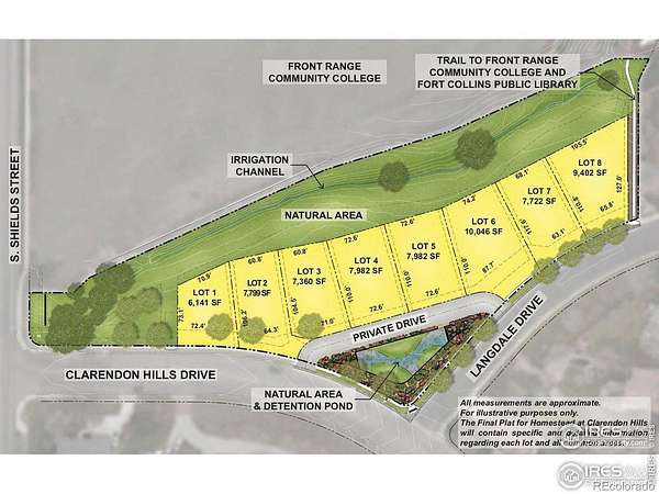 Private Service Drive - Buffer Between the Home and Public Streets. "Selling party will provide completed soils reports, house plans (2,400 +/- s.f.) and structural engineering plans inclusive of listing price. Value is approximately $20,000+Have Building Plans for a Ranch Style Home and Soil's Report in Hand! Fort Collins iconic neighborhoods with easy access to Cathy Fromme Prairie open space and trails, public and private schools and nearby shopping. Within walking distance of a new Montessori school. All lots in Homestead back up to a wildlife area with native vegetation and foothills views. Community trail leads to nearby City of Fort Collins Public Library and Front Range Community College. There are only eight home sites in this very special community. All lots face south to Langdale and Clarendon Hills Drive.