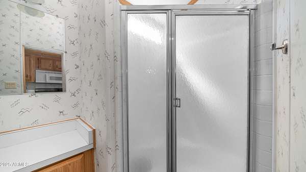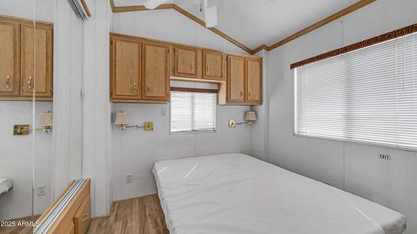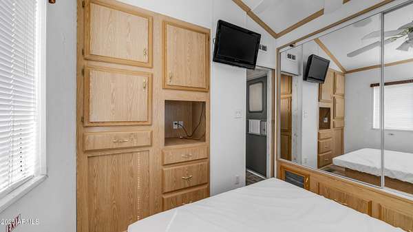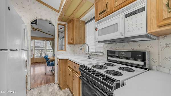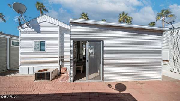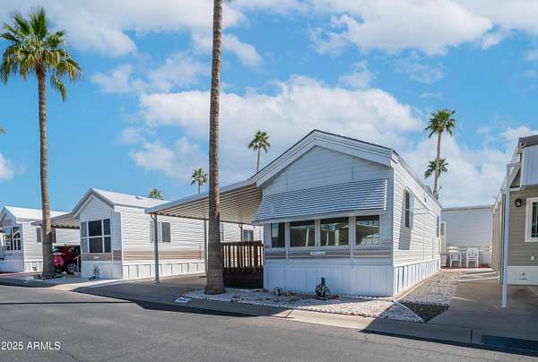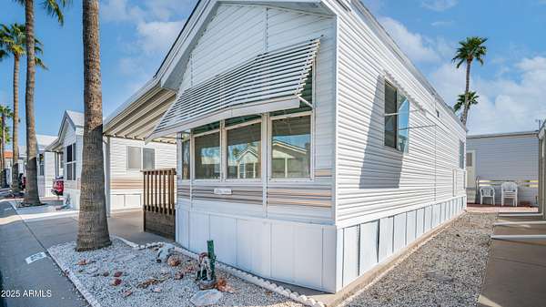 This amazing property is in a HIGHLY SOUGHT-AFTER LOCATION just STEPS AWAY FROM THE PET SECTION. As you enter the front of the home, you'll be welcomed by a WOODEN COVERED DECK-ideal for sipping your morning coffee or enjoying a peaceful evening outdoors. Head inside the home to find VAULTED CEILINGS that create a bright, airy atmosphere throughout. The UPDATED WOOD-LOOK FLOORING is not only stylish but incredibly easy to maintain, providing a modern, clean aesthetic. The kitchen is perfectly set up, featuring a SKYLIGHT that provides ideal natural light, complemented by MODERN RECESSED LIGHTING. With PLENTY OF COUNTER SPACE AND AMPLE STORAGE, this kitchen is both functional and inviting. The bathroom is ideal, offering a CORNER TUB-SHOWER COMBO for that extra room, an UPDATED TOILET, and EXTRA COUNTER SPACEperfect for added convenience. The SPACIOUS SHED/WORKSHOP, COMPLETE WITH ELECTRICITY, provides endless possibilities for hobbies, storage, or creative projects. A FIFTH GLASS WALL, FEATURING A SLIDING DOOR, enhances the flow between your indoor and outdoor spaces, offering the perfect way to control airflow and enjoy the BEAUTIFUL ARIZONA WEATHER. Step out back to the SPACIOUS, FULLY PAVED BACK PATIO, designed for LOW-MAINTENANCE LIVING and ideal for entertaining guests or simply relaxing in the sun. This home is located in the HIGHLY DESIRABLE 55+ COMMUNITY OF GOLDEN VISTA, WHERE YOU OWN THE LAND. The community is filled with an IMPRESSIVE ARRAY OF AMENITIES, including a HEATED POOL AND SPA, BATTING CAGES, PUTTING GREEN, BILLIARD HALL, WOOD-WORKING SHOP, SEWING ROOM, LIBRARY, AND SO MUCH MORE. With endless opportunities for LEISURE, RECREATION, AND SOCIALIZING, this home offers an INCREDIBLE LIFESTYLE for those looking to enjoy their GOLDEN YEARS IN COMFORT AND STYLE.