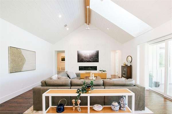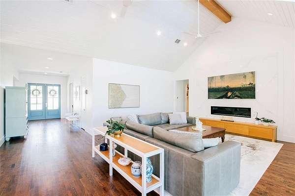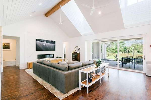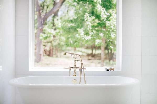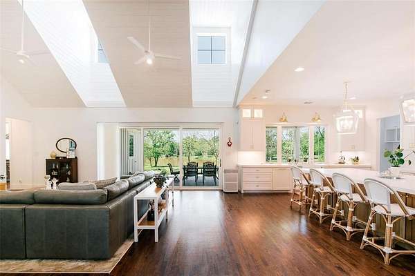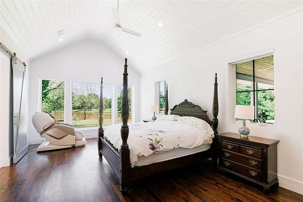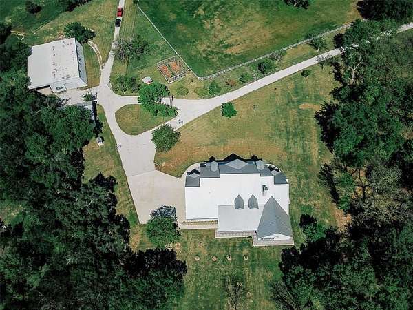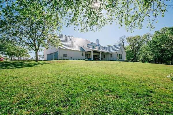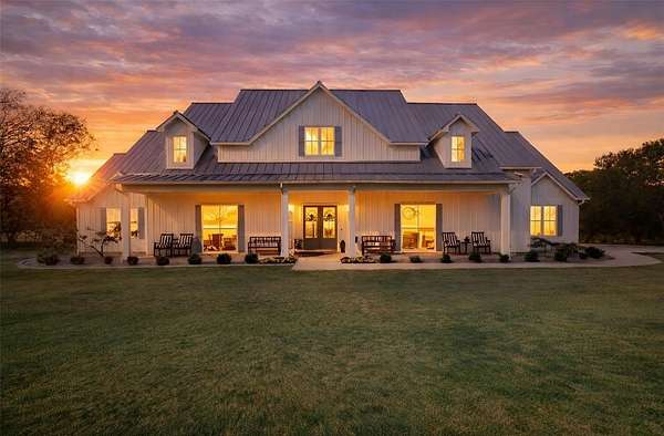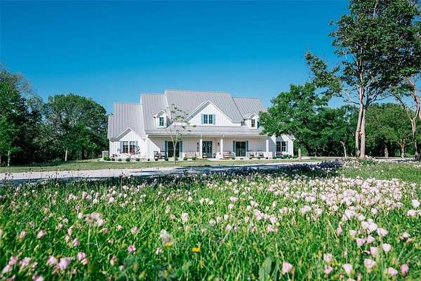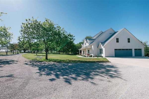 Where luxury meets tranquility, this stunning 2022 custom modern farmhouse sits on nearly 45 acres of wildflowers, mature oaks, and open pasture with prime FM 428 frontage between Denton and Frisco. Soaring vaulted ceilings, rich hardwood floors, Anderson windows, and designer lighting elevate every space. The chef's kitchen impresses with custom cabinetry, wood-wrapped range hood, gold hardware, Sub-Zero and Monogram appliances, and a generous island. The formal dining room is nothing short of spectacular at 30 by 15 feet, with lighted built-ins perfect for any occasion. The primary suite offers a freestanding soaking tub and frameless glass shower. A covered patio with stained wood ceiling and accordion sliding doors overlooks a nearly 2-acre private lake with dock. Foam encapsulation and pier-reinforced slab ensure lasting quality. Sold in conjunction with adjacent 9373 FM 428, MLS #21235523, an additional 6.65 acres and nearly 2,000 sq ft home. Come experience this exceptional signature property.