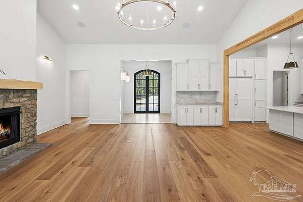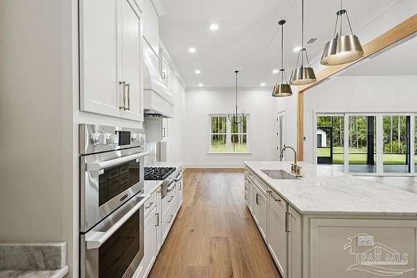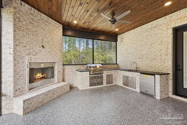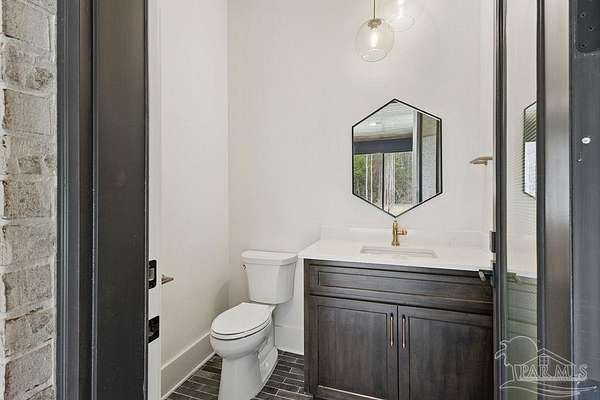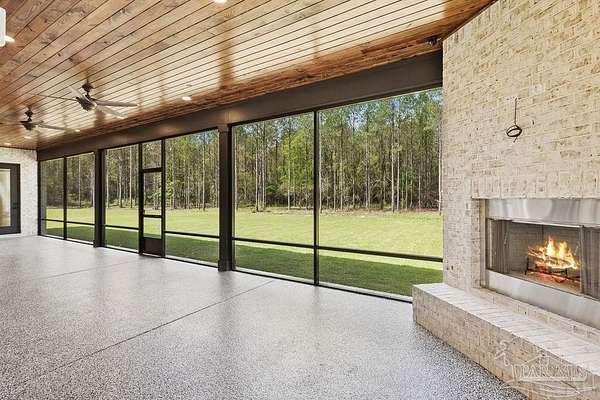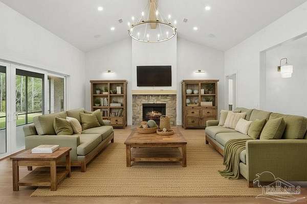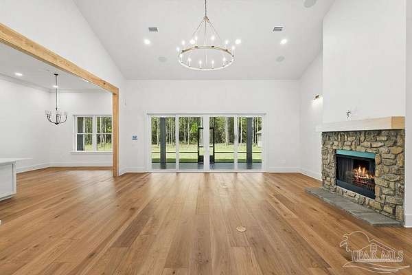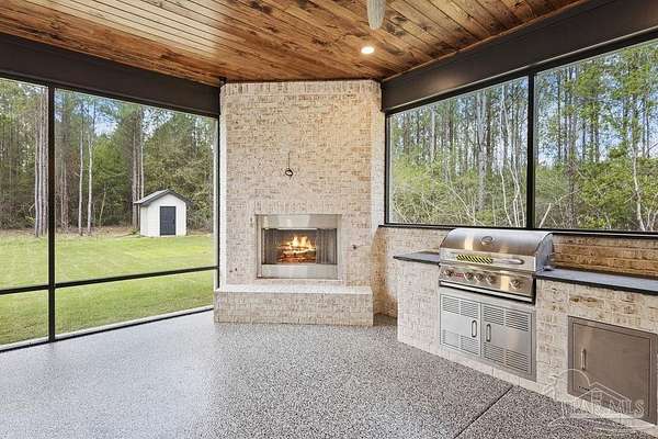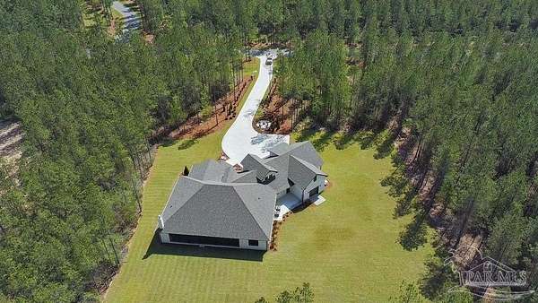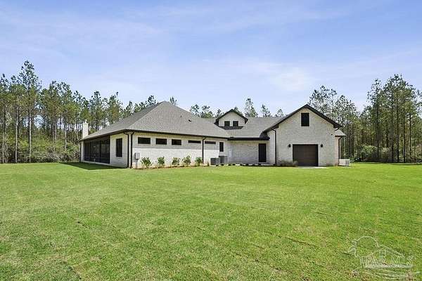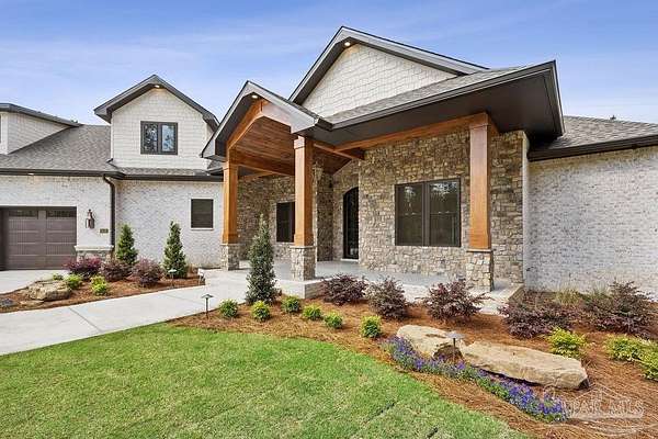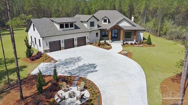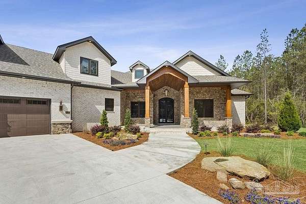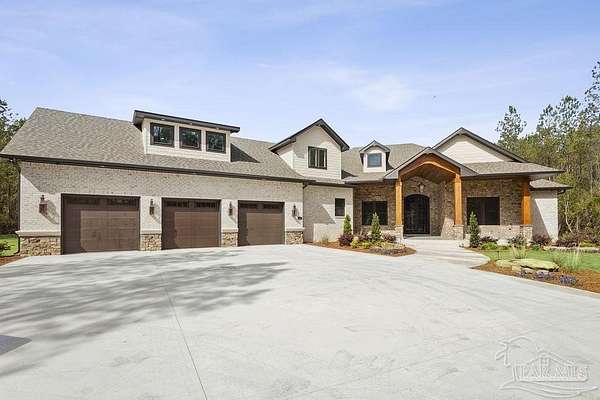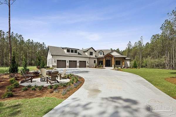 Completed and ready to move in! Introducing The Mountain Brook: a 4,300+ SQFT custom luxury estate perfectly positioned on nearly six private, wooded acres in the highly sought-after community of NatureWalk at Pond Creek. Built by one of Northwest Florida's premier builders, this masterpiece combines elegant design, functional living, and timeless craftsmanship. Step inside to an open-concept floor plan centered around a grand living area featuring a statement fireplace, soaring ceilings, and a wall of windows that flood the space with natural light. The chef's kitchen offers a large island, walk-in pantry, and seamless flow to the dining and living areas - ideal for family gatherings and entertaining alike. The primary suite is a true retreat with dual vanities, his-and-her walk-in closets connected through the laundry room, a soaking tub, and an oversized dual-head shower. Two additional bedrooms with walk-in closets, plus a flexible office, complete the main level. Upstairs, you'll find two bedrooms and a spacious additional living space or bonus room with a full bathroom which provides the perfect guest suite, media room! Outdoor living takes center stage with deep front and back porches accented by elegant columns. The back porch features a full outdoor kitchen, a cozy fireplace, and convenient half bath - ideal for entertaining or future pool access. Additional highlights include a 3-car garage with extra storage, mudroom, and thoughtfully designed spaces throughout. Experience peaceful acreage living just minutes from Pace, Milton, and the Gulf Coast's white-sand beaches, where privacy meets luxury in the heart of Northwest Florida.
