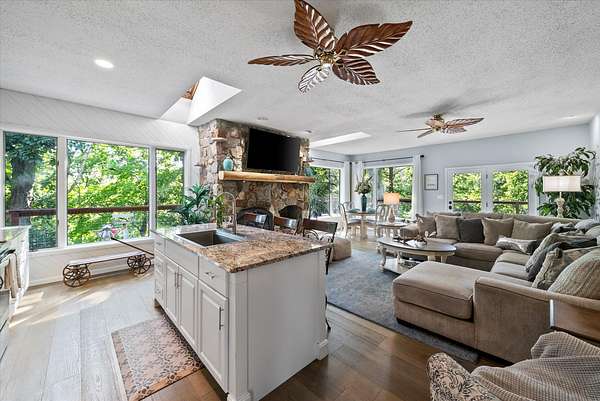 - Cable TV Available, Kitchen Island, Natural Fireplace, Split Bedrooms, Wood Floors