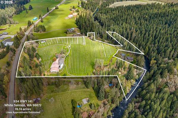 Serenely situated on the White Salmon River, this family organic orchard with remodeled 1,967 sq ft ranch offers a rare opportunity to own a turnkey orchard property in highly desirable Columbia River Gorge. Featuring 3 bedrooms and 1-1/2 bathrooms, the home blends comfort and functionality with update to all systems of the house. Lots of windows and light create a warm and inviting living space ideal for both everyday living and entertaining.Set on 19 picturesque acres, the property is a certified organic orchard with approximately 2 acres of apples and 6 acres of pears, offering both beauty and income potential. The land is well-equipped for agricultural operations, including a 2-car garage, a dedicated shop, and extensive outbuildings currently utilized for cold storage, fruit packing and cider production-perfect for supporting an established or expanding farm business.A truly unique highlight is the property's low-bank frontage along the White Salmon River, positioned just above the iconic Husum Falls, providing a stunning natural backdrop and a unique connection to the outdoors. Enjoy views of Mt. Adams, enhancing the peaceful and inspiring setting, as well as providing a perfect site for agritourism.In addition to the main residence, the property includes a 1,144 sq ft. manufactured home with 3 bedrooms and 2 bathrooms. This secondary dwelling was established for farm labor housing, adding flexibility and value to the property. The property is supported by a domestic well for drinking water, along with irrigation rights in place to draw from the White Salmon River, ensuring reliable water access for both residential and agricultural use.For those looking to step directly into a working operation, the existing orchard business-including equipment and assets-is available for purchase separately for $300,000. Don't miss this opportunity to own a productive, scenic, and versatile property in one of the Pacific Northwest's most sought-after locations.