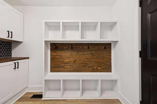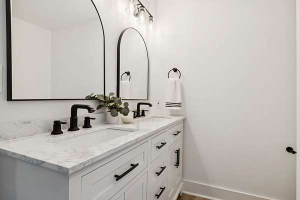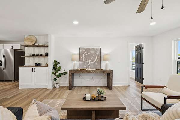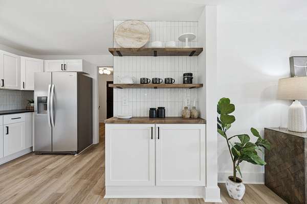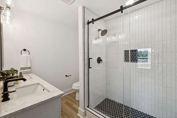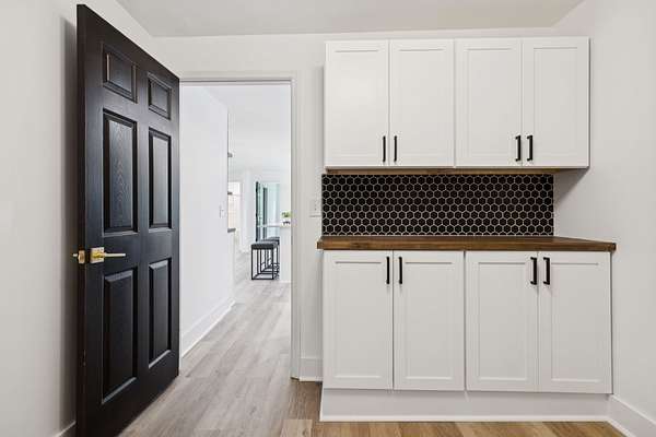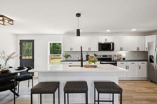 The kitchen shines with all-new cabinetry, granite and quartz countertops, stainless steel appliances, and an oversized island that serves as the heart of the home. A charming wet bar adds character, while the mudroom offers a functional space for laundry and extra storage. The primary suite provides a peaceful space with a walk-in tiled shower, double vanity, and a spacious walk-in closet. Two additional bedrooms share a freshly updated bathroom with a new vanity, toilet, and shower.