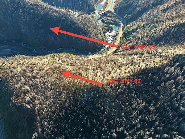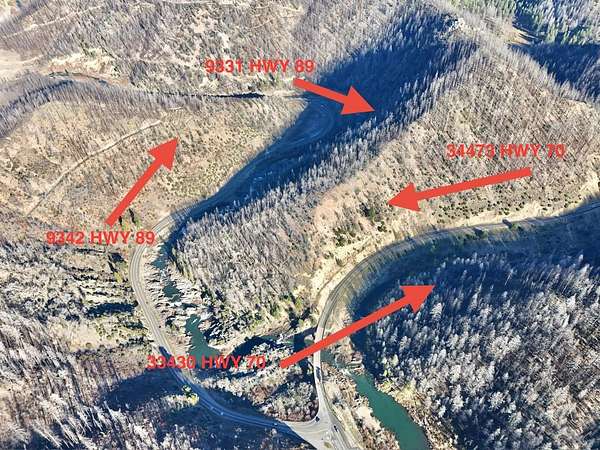 Hwy 70 from Quincy to the Greenville dY. The hwy. 70 parcels are just below the hwy. on the river and just above. The hwy 89 parcels are past the Y at the hairpin curve above the hwy. and on the other side of hwy 89 and Indian Creek. GPS is recommended