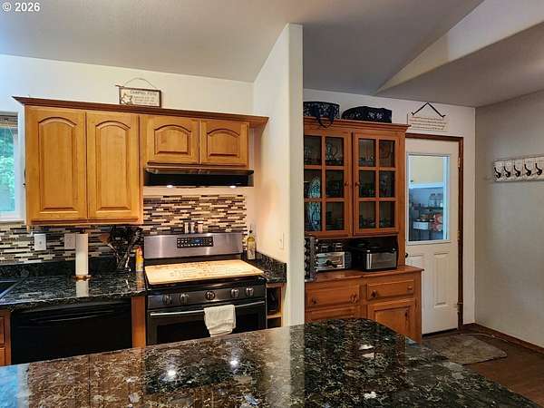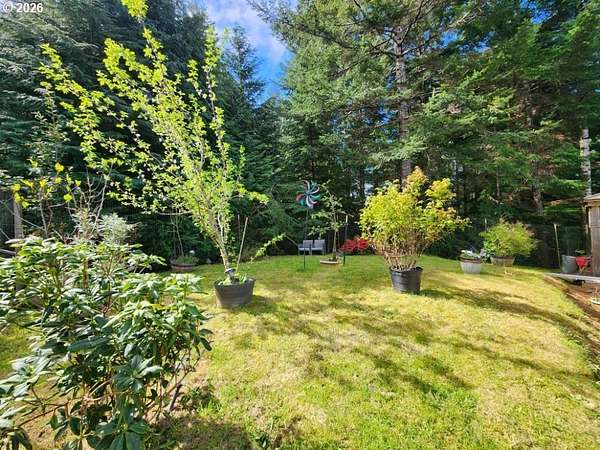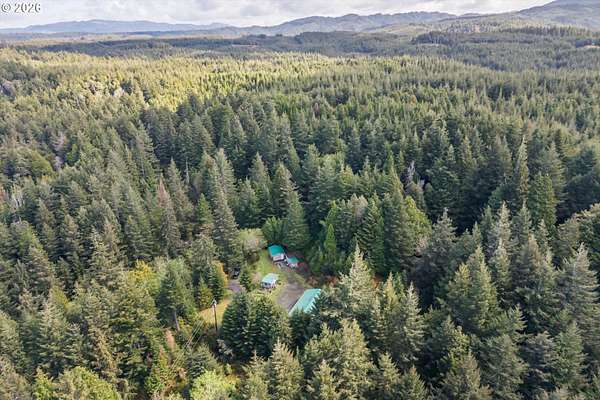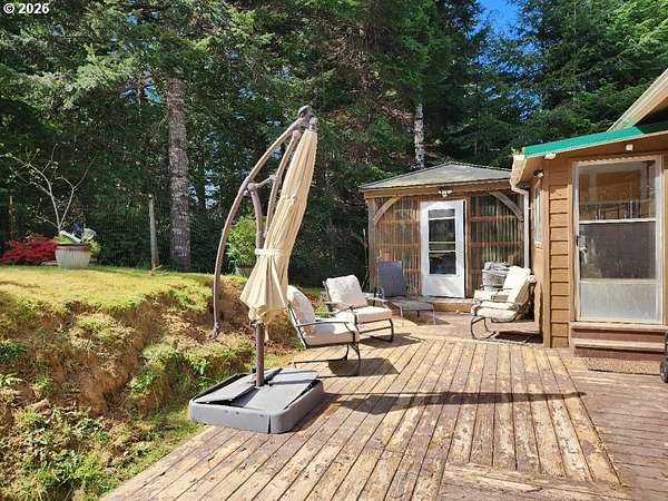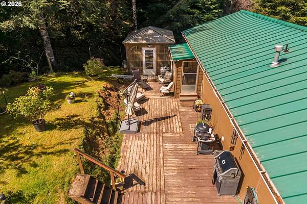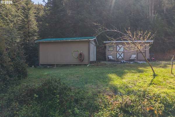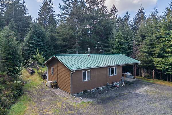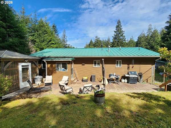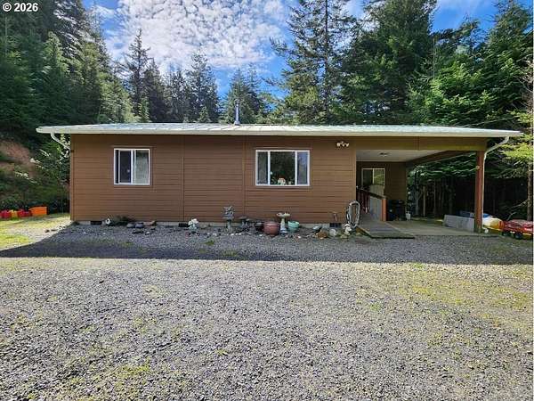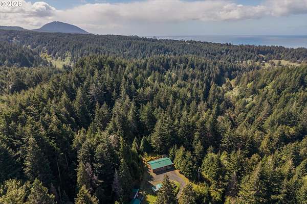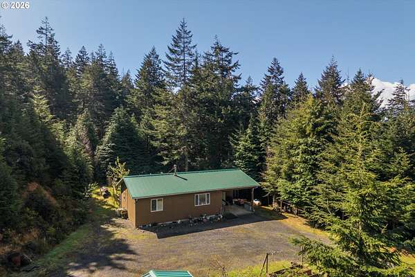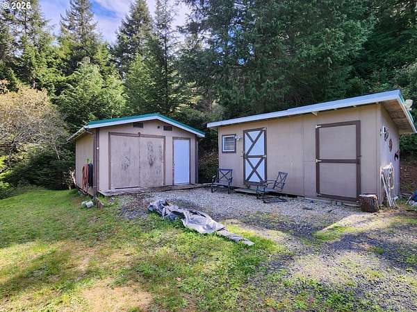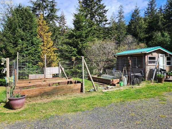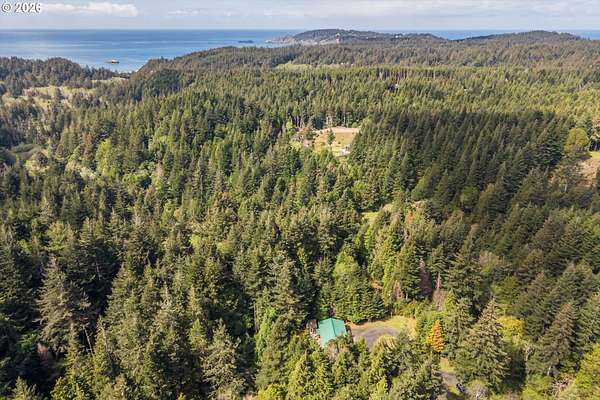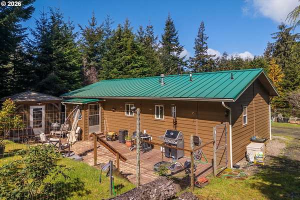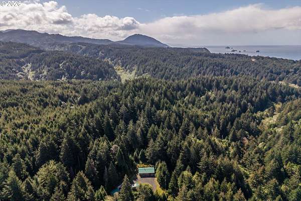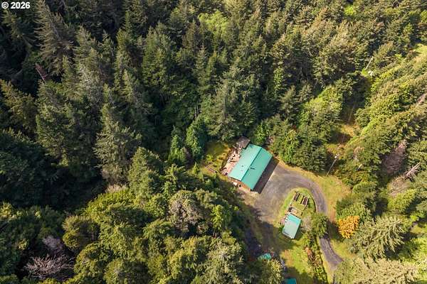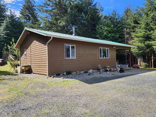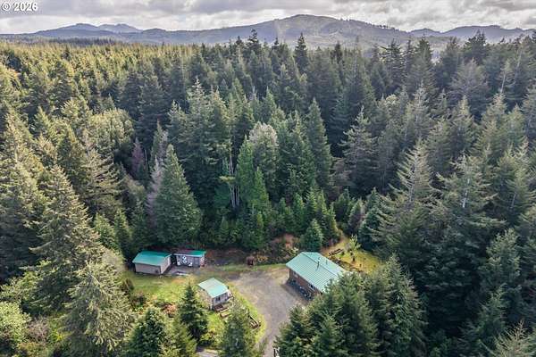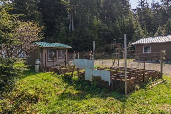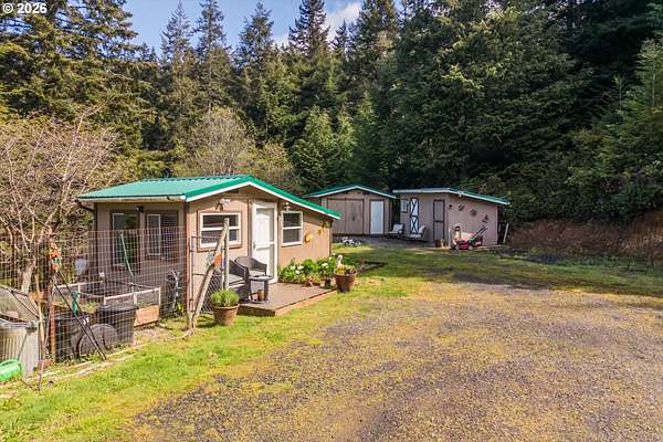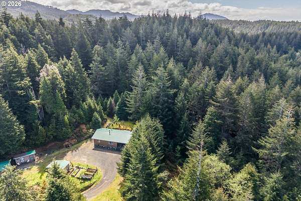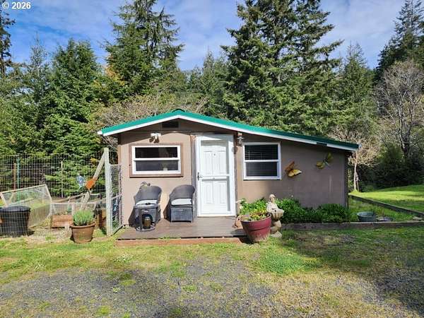 Perched at the top of a Scenic hill and surrounded by Serene forest with prime timber, this custom-built Coastal retreat offers unmatched privacy and tranquility on over 11 acres. Two tax lots with ability to build additional home. A gated driveway leads you to this peaceful sanctuary, where nature and comfort blend seamlessly. The home features granite countertops, a gas range, and a certified wood stove, creating a warm and inviting living space with ample closet storage throughout. Step outside to enjoy the expansive back patio-perfect for relaxing or entertaining in a quiet, natural setting. The property is thoughtfully equipped with a variety of functional and lifestyle amenities, including a private Studio, Workshop, Storage shed, and Wood shed. A charming enclosed Gazebo with a Hot Tub offers a perfect place to unwind, while the fenced garden with raised beds is ideal for those who enjoy growing their own food. Located just a short distance from Hubbards Creek, you'll have easy access to surfing and beach adventures, making this an ideal Coastal getaway or full-time residence for those seeking privacy, space, and connection to the outdoors.
