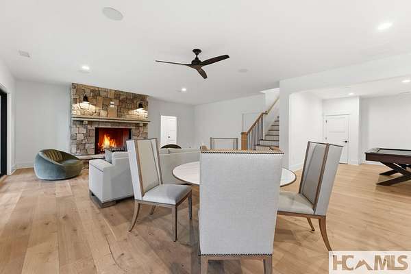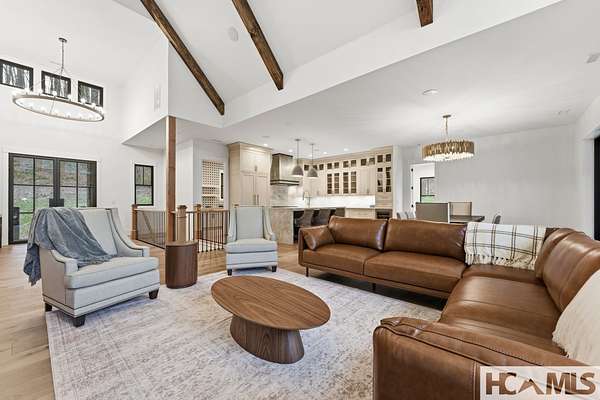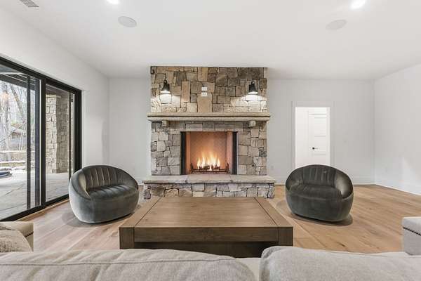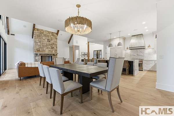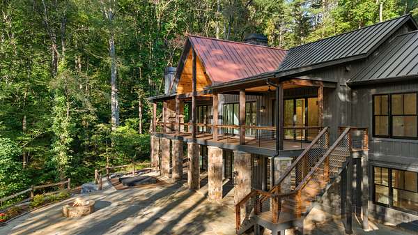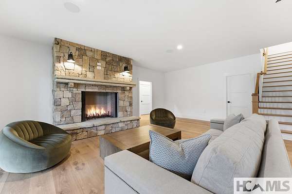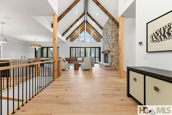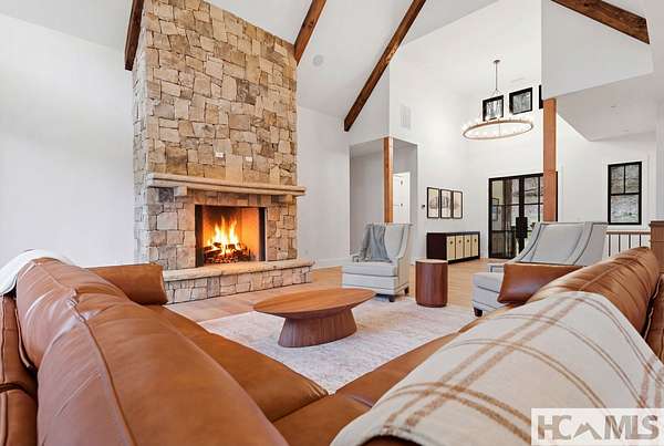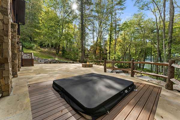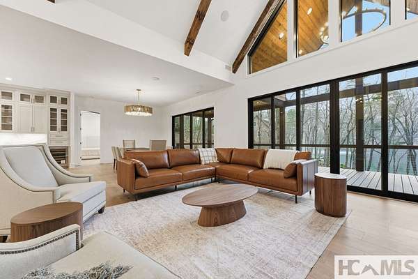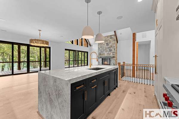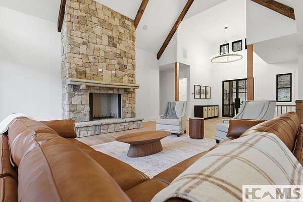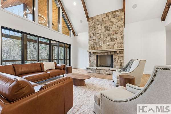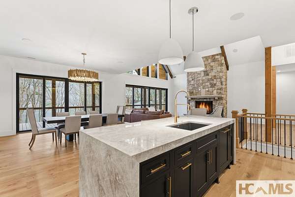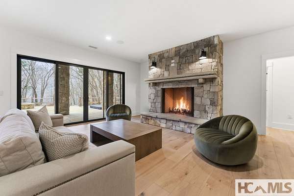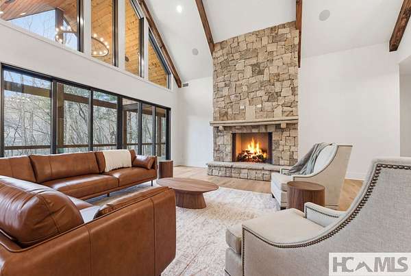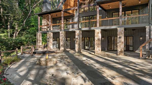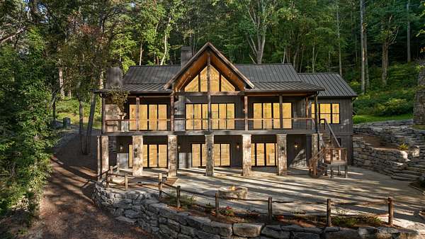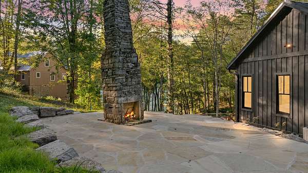 Enjoy breathtaking views of Lake Glenville from this brand-new, high-end construction nestled in the exclusive gated community of Glenshore. This 5-bedroom, 5.5-bath masterpiece-with an additional bonus apartment above the two-car garage-offers the perfect blend of refined elegance and comfortable mountain living. No detail has been overlooked in the thoughtful design and craftsmanship of this home. A historic chimney has been artfully preserved and reimagined as an outdoor fire pit centerpiece, surrounded by intricate stonework that enhances the outdoor spaces. The main level features a spacious primary suite with a luxurious ensuite bath and dual walk-in closets, along with a guest bedroom complete with its own private bath. The open living room, anchored by a cozy fireplace, flows seamlessly onto a covered deck with a second fireplace-an inviting space for entertaining or enjoying quiet evenings by the lake. A formal dining room and chef's kitchen with commercial-grade appliances create the perfect setting for memorable gatherings, while a convenient half bath and full laundry room complete this level. Downstairs, you'll find three additional bedrooms, two bathrooms, and a large family room ideal for games and relaxation, plus a billiard/game room perfect for family game night. One bedroom is currently outfitted as a home office, providing flexibility for remote work or creative space. Step outside to enjoy the beautifully landscaped stone patio, hot tub, and fire pit-all designed for lakeside living at its finest. This exceptional property combines lakefront serenity with timeless design, creating a one-of-a-kind retreat for family and guests.