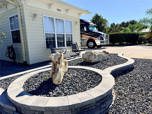 The 26' x 76' concrete pad offers full hookups, with soft water conveniently plumbed to the pedestal through the property's upgraded water softener system. Extra pavers provide additional golf cart parking, and the front seating area is the perfect spot to wave to neighbors and soak in the friendly atmosphere. Across the street, your windshield view looks out to peaceful community green space. A 12' x 16' covered pergola and additional rear hardscaping make outdoor entertaining effortless -- there's room for everyone!