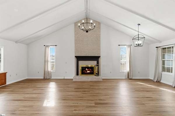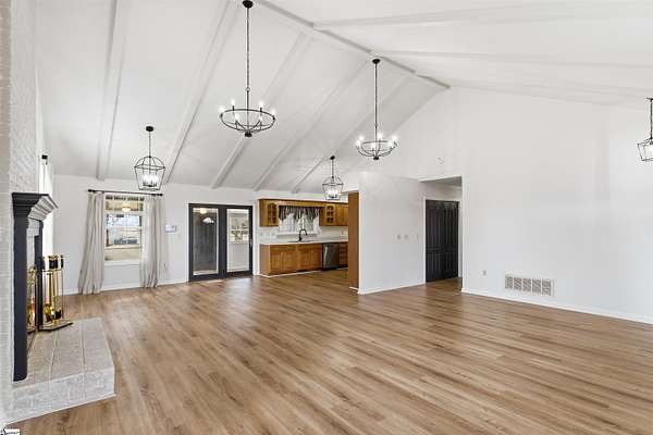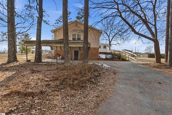 Listing by Julie Fowler with Coldwell Banker Caine - 864-607-6300 - jfowler@cbcaine.com - Enjoy peaceful country living in this well-built and meticulously maintained 2-bedroom, 2-bath home nestled on 3.69 beautiful acres. The open-concept floor plan with vaulted ceilings creates a welcoming, spacious feel--perfect for relaxing or entertaining. The large primary bedroom features two walk-in closets and a private ensuite with a deep soaking tub, double vanity and separate stand-up shower. Outside, you'll find two outbuildings, a large pasture ideal for animals or hobbies, and a wooded area offering privacy and natural beauty. Additional features include a, enclosed back porch, partial basement with a workshop area, covered carport, ample parking, and a handicap-accessible ramp (removable if preferred). A wonderful blend of comfort, functionality, and wide-open space--this property offers the country lifestyle you've been looking for, just 5 minutes to the charming downtown Woodruff, SC.
