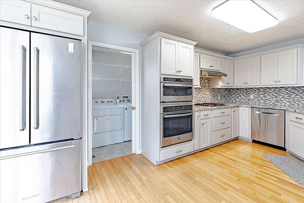 - Built-In Electric Oven, Dishwasher, Disposal, Dryer, ENERGY STAR Qualified Appliances, Freezer, Gas Range, Microwave, Refrigerator, Stainless Steel Appliance(s), Washer