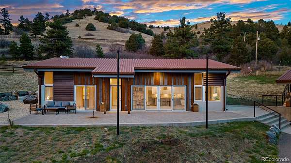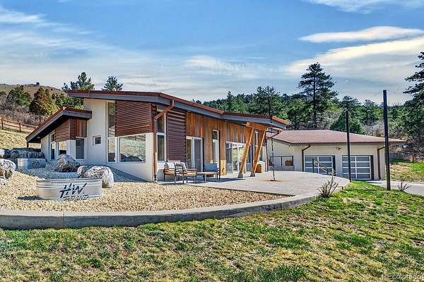 OFFER RECEIVED. IF YOU HAVE INTEREST IN THIS PROPERTY, PLS CALL LA @303-847-8555. Thank you! Welcome to 9362 Jennings Rd! Surrounded 360° by mountain views this home is nestled on nearly 9 acres and built with ultimate sustainability and GREEN ENERGY in mind. Designed by Barrett Studio Architects in Boulder, and built in 2018, this property represents a perfect blend of rich craftsmanship, raw and rustic materials, and modern detailing. This is a COLORADO RANCH HOUSE, responsive to the barn and animals, mountains, big sky, intense wind, and rugged dryness…a home for living dreams! Imagine a home that can produce enough renewable energy to meet its own annual energy consumption, and more, giving back to the electrical grid. All this is possible by combination of passive solar design (concrete floors and a heavily glazed south-facing wall), high performance building technology, and renewable energy systems (ERV for heating and cooling). 5.2 kW full south facing ground mount ACTIVE SOLAR system produces enough to eliminate the energy bill completely. Seller’s annual cost towards heating is roughly $200 for bags of wood pellets. Triple pane windows limit heat loss and condensation in the winter, while the low sun floods the space and provides PASSIVE SOLAR heating, absorbed by the concrete floor’s thermal mass. In the summer, the roof overhang shades most of the south-facing glass, while the home’s narrow profile, and ERV renewable energy system provide cross ventilation cooling. Seamless transition from landscape to architecture is complimented by both indoors and outdoor open spaces with views and literal connection to nature. The BARN has equipment and hay storage, shelter for 3 HORSES and a fenced corral, round pen and pasture. The detached garage boasts ample cabinets and storage plus 260 sf finished/heated office or bonus space. Highly resistant to wind, hail, fire, and snow STEEL ROOFING will last generations! Truly one-of-a-kind HOME!
