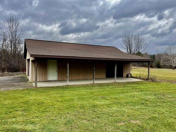 Nestled on a sprawling 6-acre parcel, this ranch-style home delivers countryside peace with generous room to roam. Set back on a quiet private road, the land offers abundant space for recreation, gardening, hunting or simply enjoying nature. Inside, you'll find a comfortable 1,364 sq ft single-level layout, offering three bedrooms and two full baths. The open living area with cathedral ceilings flows into an eat-in kitchen, while amenities include central air, ceiling fans, and a handicapped-accessible bath. The attached two-car garage adds everyday convenience. A significant highlight is the large 24' x 40' pole barn -- a versatile and practical feature perfect for equipment storage, hobby space or additional garage capacity. With six acres to call your own and a substantial outbuilding to support your lifestyle, this property blends functional rural living with accessible comfort -- ideal for those seeking a home plus land and storage all in one.
