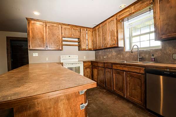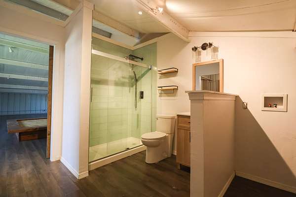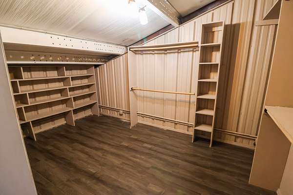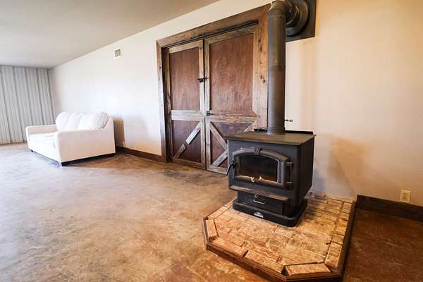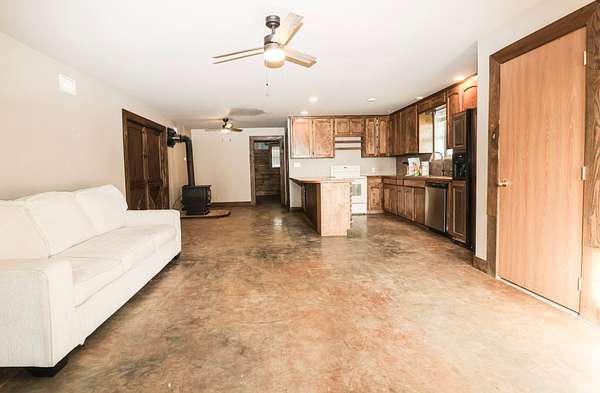 At the headquarters of the property is the barndominium that blends comfort, functionality, and the feel of a true weekend retreat. Positioned to take advantage of the surrounding landscape, the living quarters offer an open-concept layout with a full kitchen, abundant wood cabinetry, pantry, recessed lighting, and durable stained concrete flooring throughout the main level—perfect for low-maintenance living after a day outdoors.