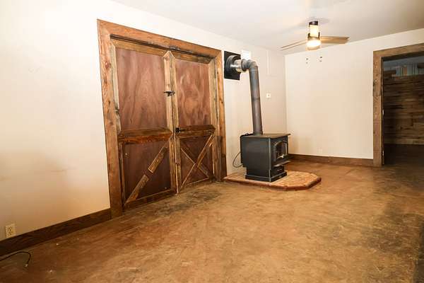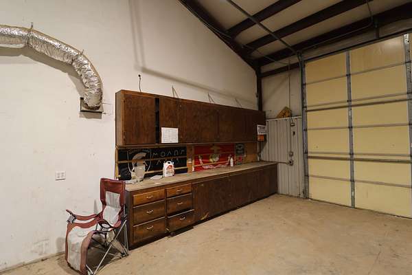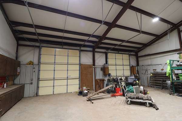 On the main floor, step through the double barn doors into one of the property’s best features—the large, highly functional workshop built with the landowner in mind. With high ceilings, dual 12-foot roll-up doors, concrete flooring, and multiple 120V and 220V outlets, this space is well-suited for equipment storage, projects, and day-to-day use.