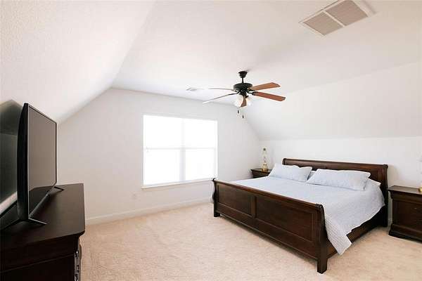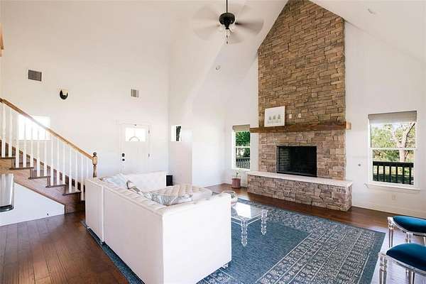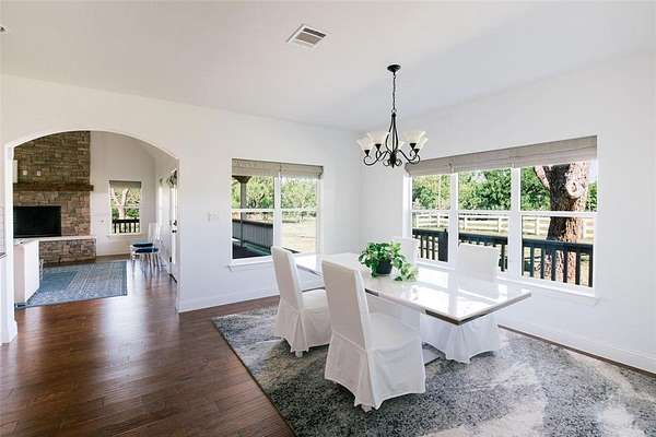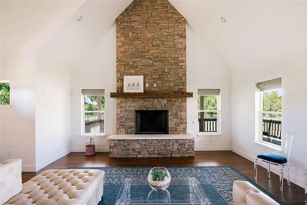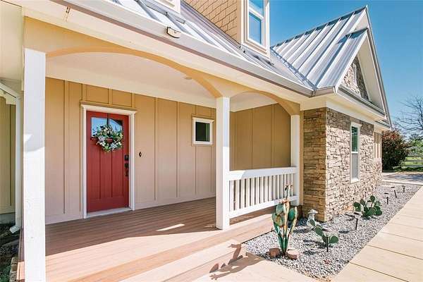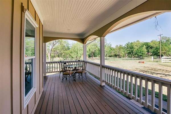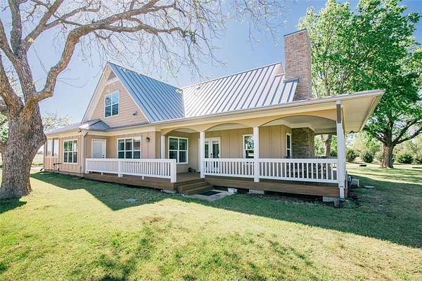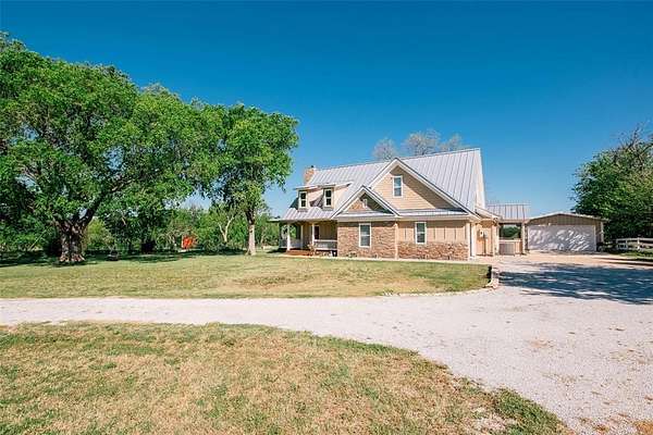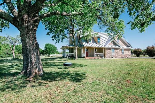 Nestled beneath mature trees and framed by sweeping views, this charming 2015 home at 9373 FM 428 offers 1,976 sq ft of warmth and character on 6.65 acres. A welcoming wrap-around porch and a private screened porch off the primary suite invite you to slow down and take it all in. Inside, a floor-to-ceiling stone fireplace anchors the living room, while rich hardwood floors and a spacious kitchen with white cabinetry, subway tile, granite counters, double ovens, gas cooktop, and farm sink make this home as beautiful as it is inviting. The main level primary suite features an ensuite bath, with two additional bedrooms upstairs. A one-car attached garage, detached two-car garage with extra storage, and well-fed sprinkler system round out this truly special property. Whether enjoyed as a primary residence or guest house for the adjacent 9325 FM 428 estate, endless possibilities await. Sold in conjunction with 9325 FM 428, MLS #21235502. Come experience this exceptional property.