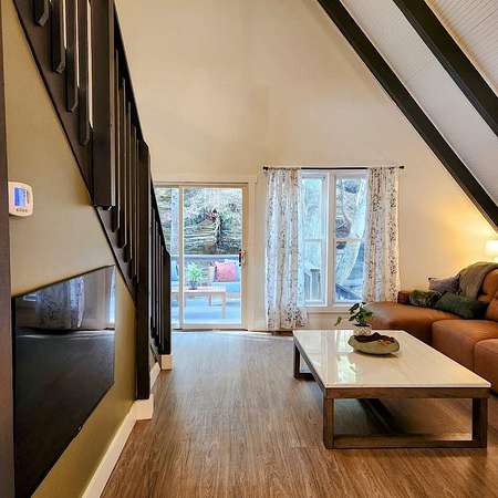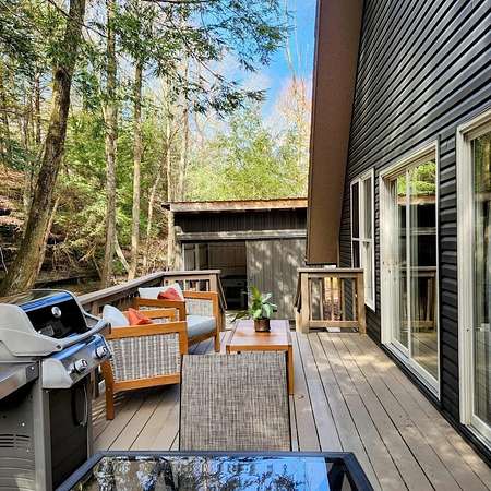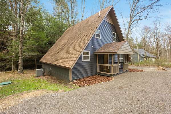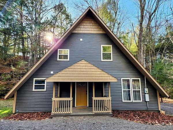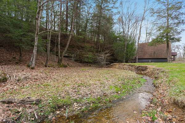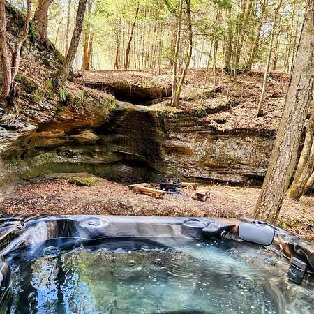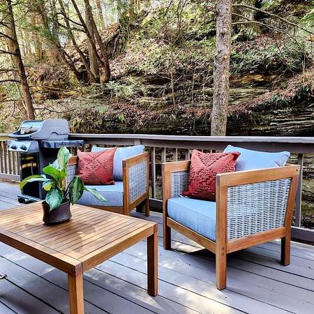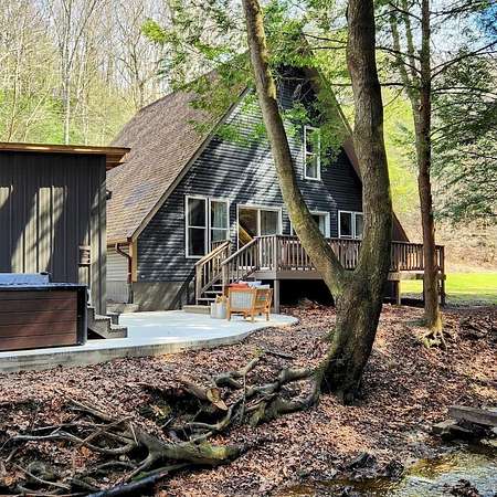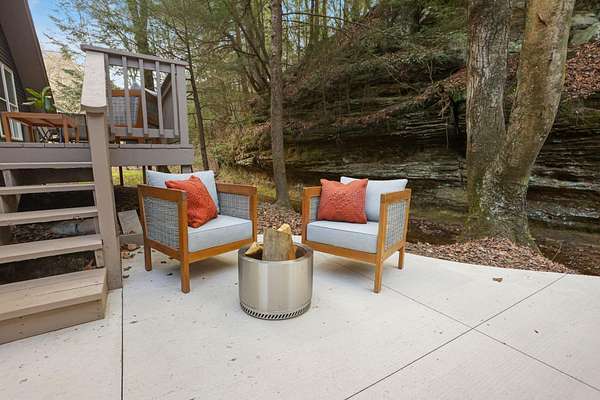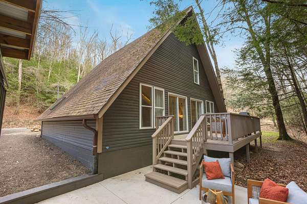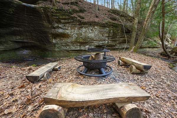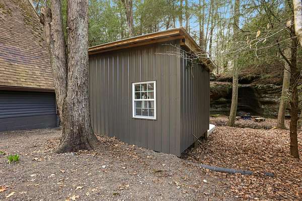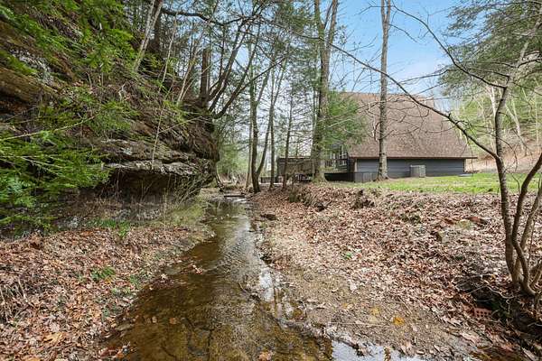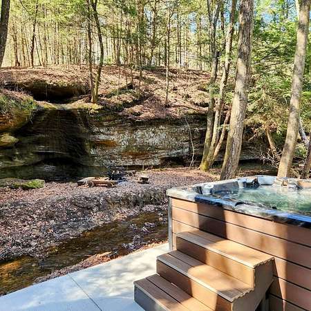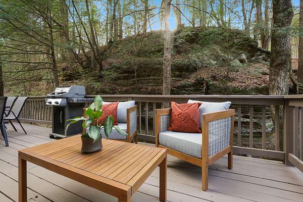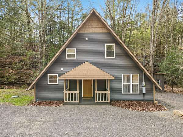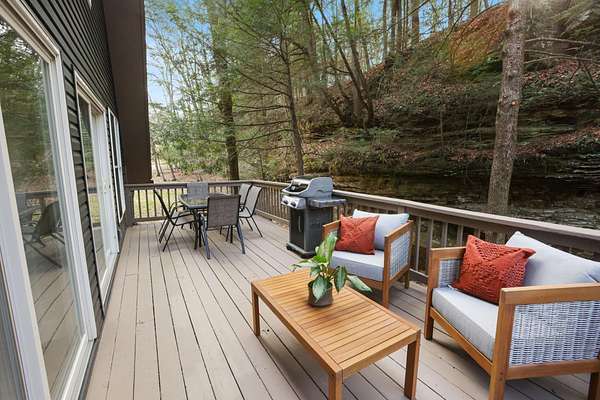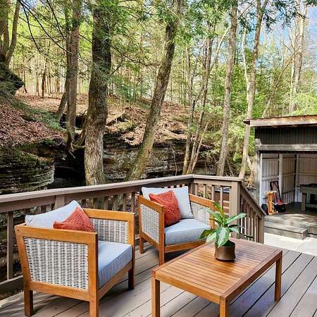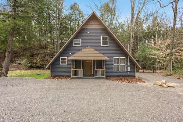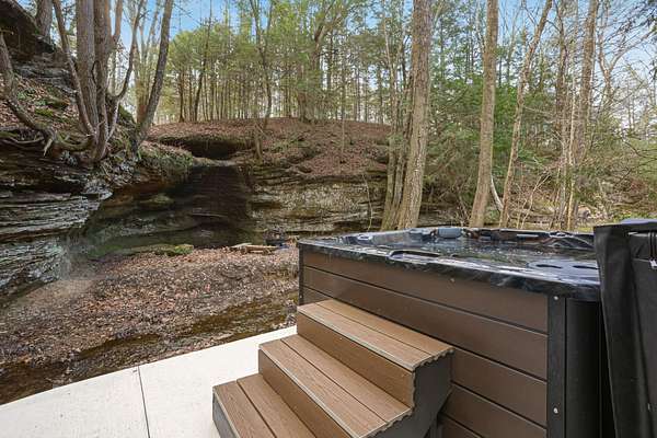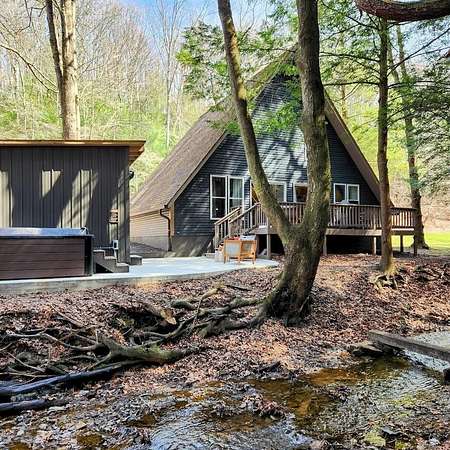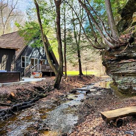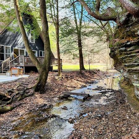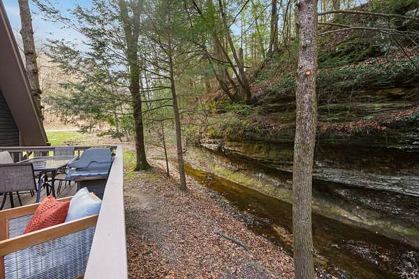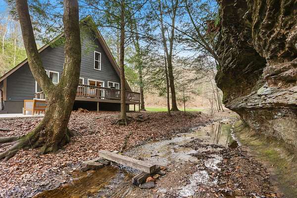 Discover RockFall Retreat, a breathtaking A-frame cabin nestled among striking rock formations with a seasonal waterfall and creek just steps from the back door. This fully furnished, turn-key property is a rare opportunity to own a nature-rich getaway as a short-term rental. The sale includes all furnishings and existing bookings, making it a turnkey investment. Boasting 4 spacious bedrooms and 2 full baths, the home comfortably sleeps up to 12 guests. Inside, you'll find a warm and inviting open-concept living space with soaring cathedral ceilings, a fully equipped kitchen with seating for 12, and direct access to the outdoor patio. The layout includes two king bedrooms on the main level-one with private patio doors-a cozy upstairs queen room, and a large bunk-style room featuring three queen beds, a TV, and a mini basketball hoop. Outside, enjoy a private hot tub overlooking the stunning rock formations and waterfall, or gather around one of two firepits for evenings under the stars. The spacious patio includes a dining area, seating, propane grill, and a smokeless firepit. A separate game shed offers endless entertainment with air hockey, foosball, cornhole, croquet, giant yard games, and more. With direct access to a scenic creek, this property provides the perfect balance of adventure and relaxation. Located just minutes from Hocking Hills and Clear Creek Metro Park, RockFall Retreat is ideal as a private escape or an investment opportunity with strong rental potential. Don't miss your chance to own this extraordinary property-schedule a showing today. Agent/Broker owned.