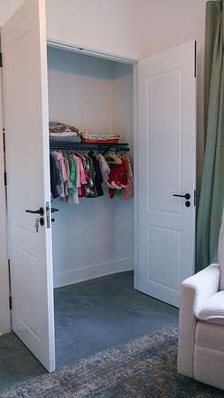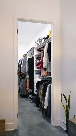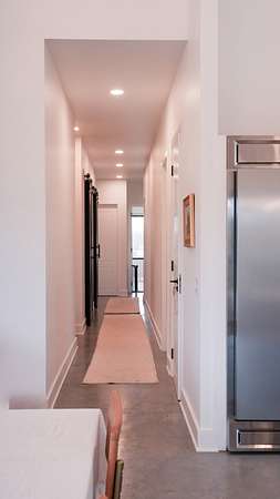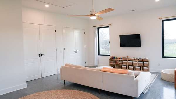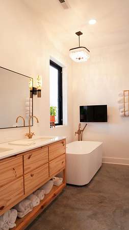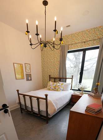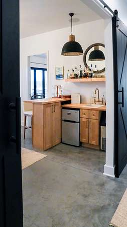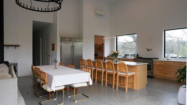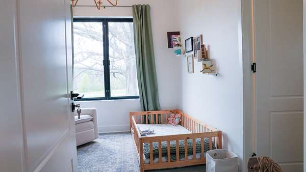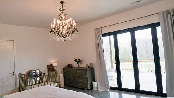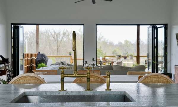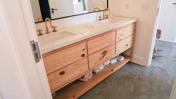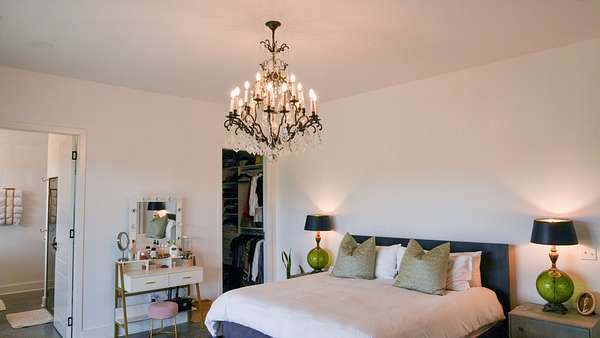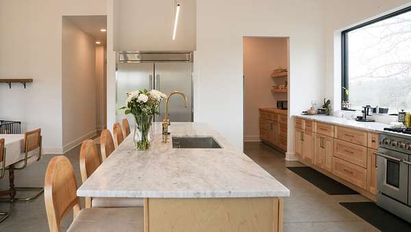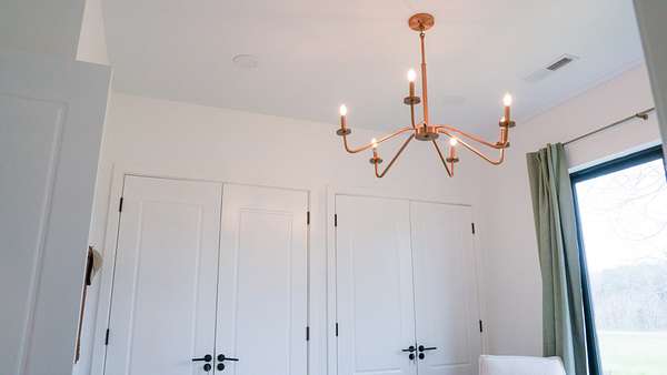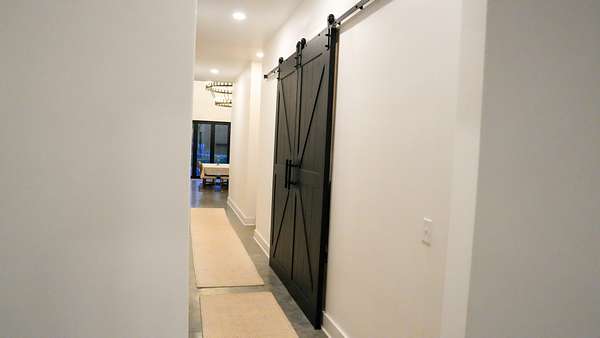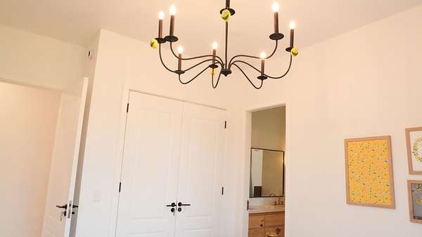 Inside, every detail was curated for impact: marble countertops, solid Moroccan brass fixtures, a 60” XL refrigerator, 8-burner gas range with pot filler, and a full secondary pantry with additional refrigeration. The open-concept living space is flooded with natural light through 6x6 casement windows, while the private owner’s suite offers a spa-like retreat with freestanding tub, steam shower, and expansive walk-in closet. The large lounge/office area just off the primary suite features a wet bar and porch access. Two additional bedrooms share the Jack and Jill bath with separate dual sink vanity area to help ease morning routines. The extra large 5th bedroom is currently being used as a playroom.