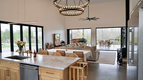Welcome to this custom-built 3,360 sqft barndominium on 7.42 waterfront acres on Lake Karen. Designed for those who crave space, privacy, and elevated living, this 5-bedroom, 3-bath masterpiece features soaring 22-ft ceilings, accordion aluminum doors, and a 2,000 sq ft covered porch built for unforgettable entertaining—with gorgeous lake views and stunning sunsets. (plumbing in place for your dream outdoor kitchen.)