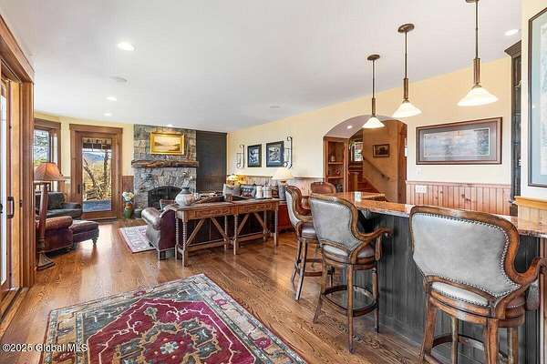 Welcome to your dream lake VIEW home, nestled on nearly 5 acres of serene beauty. Seller will consider selling separately a DEEDED DOCK located just 2.5 miles to the purchaser of this home. This exquisite property features the highest quality of materials and finishes. The gourmet kitchen is a chef's paradise, equipped with Viking, Bosch, Sub-zero appliances, a copper farm sink, and travertine floors. Enjoy solid oak hardwood floors and the convenience of central A/C and Sonos surround sound. The primary BR offers a gas FP, a custom-built closet, with luxurious en-suite bath with heated floors, a soaking tub, and large shower. Relax in the movie room, office or 4th BR with its own exterior entry. The heated 3-car garage includes workbench and storage above.