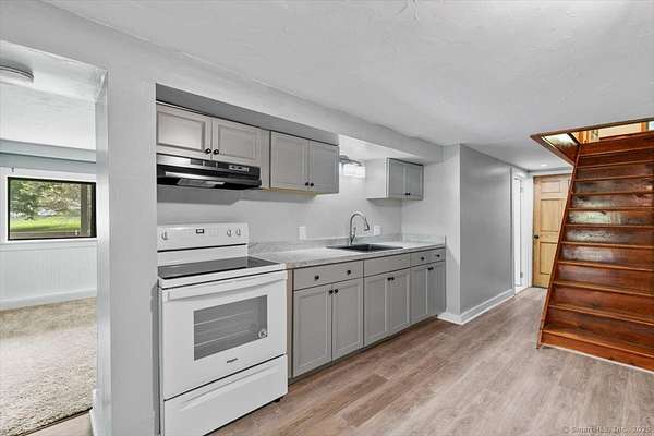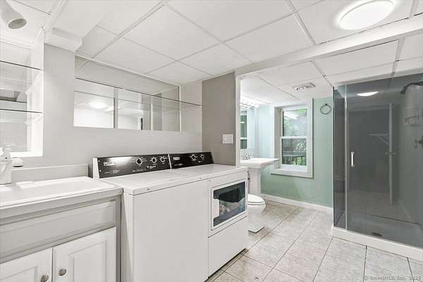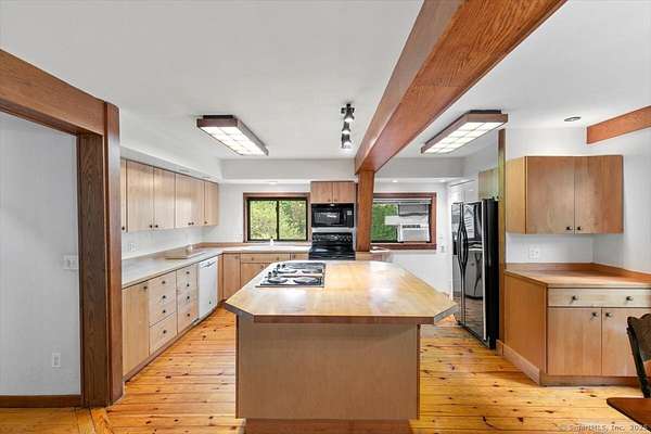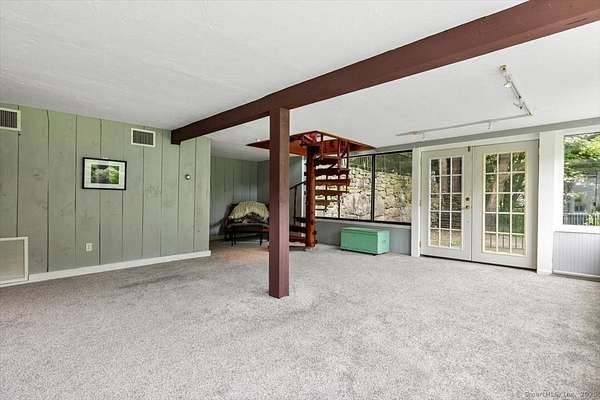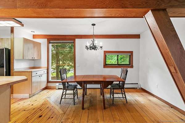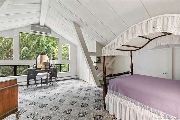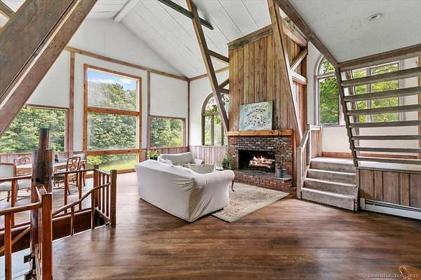 Built in 1900 as a barn and converted to a home in 1990, the architecture fuses countryside charm and mid-century design - two contrasting genres married to create an interesting and unique experience. The home is entered via an offset entry that opens into an all-seasons sunken sunroom overlooking the expansive backyard. You flow directly into the eat-in kitchen, which is outfitted with maple cabinetry. As you ease down the hall, you'll pass a bedroom, a full bath, and an office. The final room is the living room, highlighting the mid-century style element of bringing the outdoors in with floor-to-ceiling windows across the entire back wall. The home's placement at the uppermost portion of the acreage allows for views that fill the windows, creating a sense of space and openness. The living room has two stair passages, one leading to the ground-level apartment and the other to the sleeping quarters on the second floor. The staircase which leads to the second floor has a small loft which overlooks the living room and leads to three bedrooms and a shared bath . The primary suite mirrors the living room with wall-to-wall windows overlooking the verdant acreage. The lower, ground level has a complete apartment with a private exterior entry for guests or rental potential. The foundation for a breathtaking Litchfield County home is here, welcoming your imagination and eye for design.
