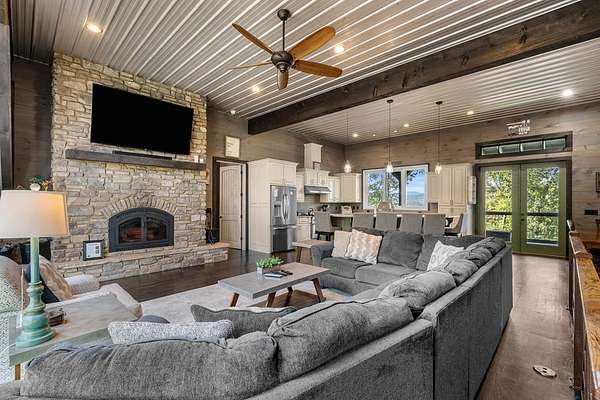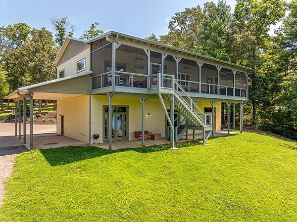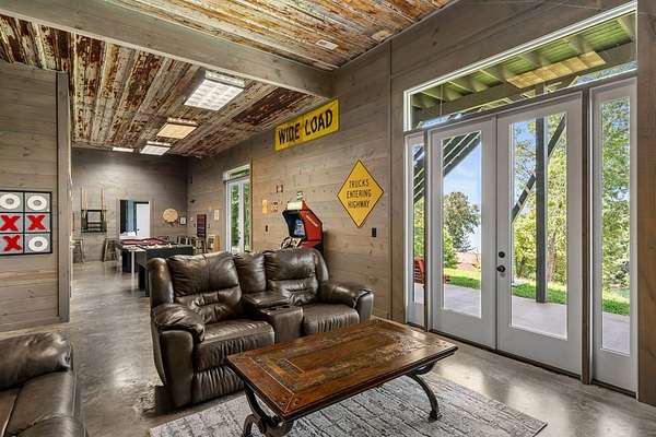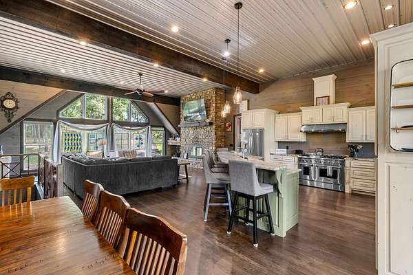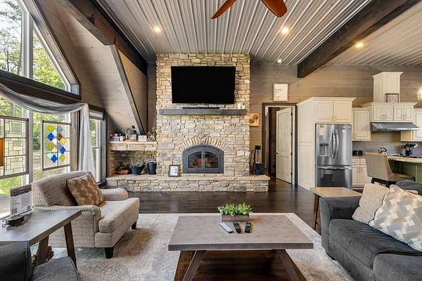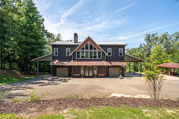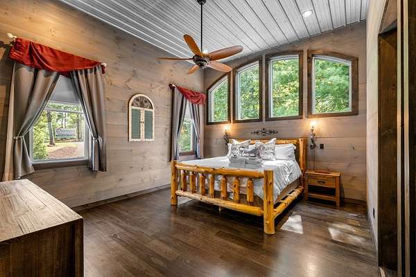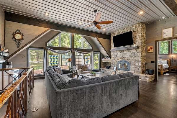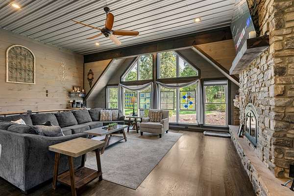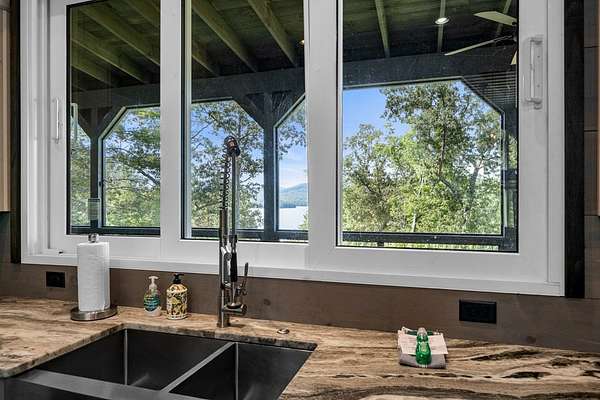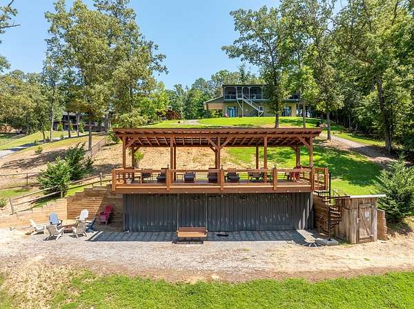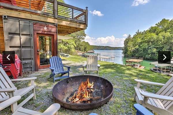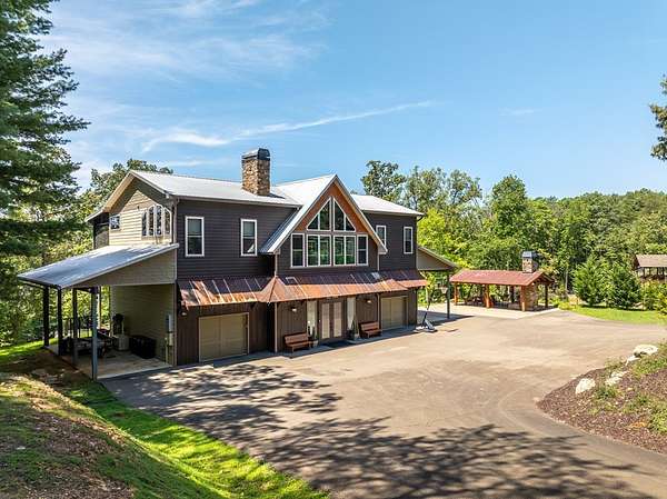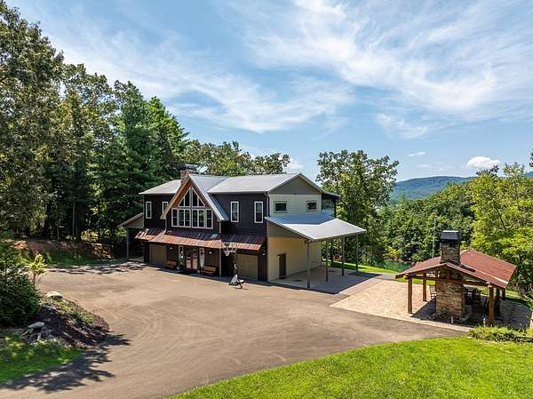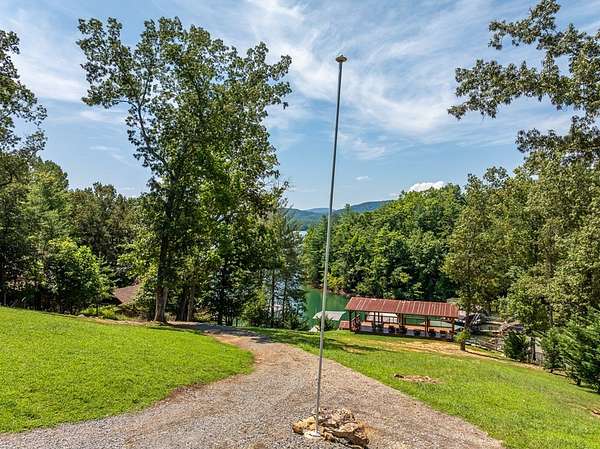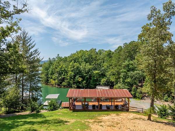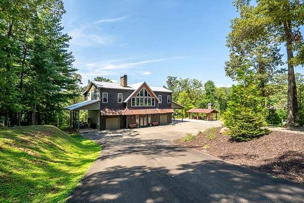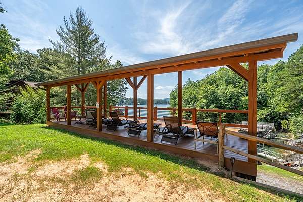 "LIVE LOVE LAKE" really does have all the extras! Welcome to one of the funnest and most unique homes on Lake Blue Ridge, which features a lakeside "container" bar with roll up windows and lounge deck on top, a covered pavilion with the original old stone chimney of the property, a whole house generator, 50 amp RV hookup with a waste dump, 4x4 paths and concrete steps leading down to the dock, and a black-top circular driveway with plenty of parking. All on 1.5 acres! Inside you will find unique customizations everywhere, from the rough-sawn wood walls, large picture windows, high ceilings, spacious bedrooms, and rusted tin accents. The living room boasts a stacked stone wood burning fireplace with built-in firewood storage and stone shelving, alongside a gourmet dream kitchen with a large sliding window above the sink to overlook the sparkling lake and mountain views. In the massive primary ensuite you'll find large windows, super high ceilings, and a bathroom with antique vanity sinks, a soaking tub, a tile shower, and a very spacious walk-in closet. Two more upper level bedrooms with a full bath that features a custom canoe vanity! On the ground level, you'll find the laundry room, a full bath, a large gaming room with a lounge, another guest room, and a triple bunk room with a swirly slide from the top (each of these rooms have ingress/egress to outside). Relax on the patio or the screened in back deck in the hot tub. As if the home itself is not enough, it comes FULLY FURNISHED as a very successful STR! No need to leave this property for fun but if you do, town is less than 10 minutes away. This one you will truly need to see it to believe it! Perfect for events (with an event permit) and entertaining.