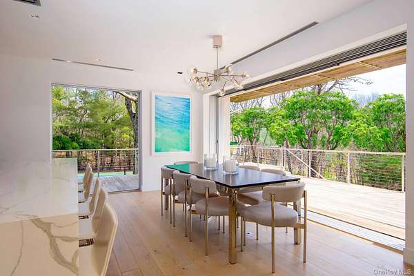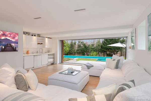 In a class by itself, New to Market, exquisite Malibu Style Modern Contemporary perfectly suited on a meticulously well-kept shy 2-acre parcel with Pool and Tennis offering the Ultimate in Hamptons Resort Style Summer living. Magnificently positioned and perched high above is where you'll find this exceptional Hamptons 4 level Modern bathing in full privacy and greenery with its commanding views of the full-sized North/South Tennis and its oversized 52x18 heated Saltwater Gunite Pool. Here summer never ends with its pool and jacuzzi wrapped in white marble and sprawling green lawns which take center stage all summer long. Boasting 6725 sqft of luxurious open and modern resort style living spaces on 4 levels which feature soaring ceiling heights, an abundance of natural light and its expansive sliding glass doors which magically blend the indoor and outdoor spaces effortlessly creating the ultimate Hamptons entertaining space. Guests of all ages will enjoy the well-appointed 4 Guest ensuite beds found on 2 private levels plus the additional private Owners Suite which occupies the entire 3rd floor, complete with Resort Style Spa bath and breathtaking views. For the discerning Chef, a fully outfitted Chefs Kitchen with its professional high-end stainless-steel appliances and large center island sit ready and waiting to deliver the ultimate dining experience while enjoying marvelous Tennis and Poolside views. A whole range of amenities are available on level 1 that enliven this unequaled Hamptons Summer Getaway, which include a Cinema room, Fitness center, sprawling lounge and its well-furnished wet bar. While serenity enwraps this captivating Hamptons retreat, it lies in superbly convenient proximity to world renowned Sag Harbor, Bridgehampton and Southampton shopping districts and its beloved Ocean Beaches.,