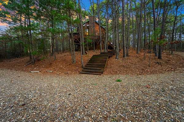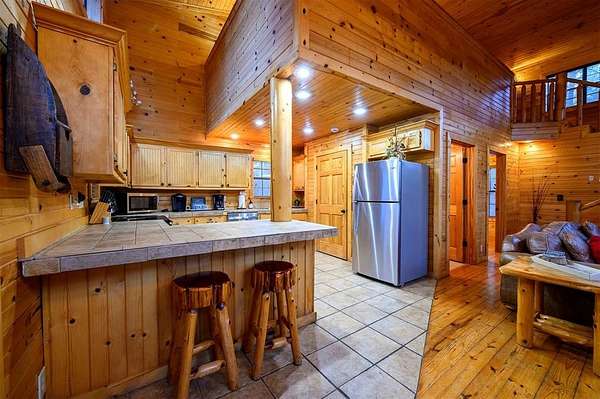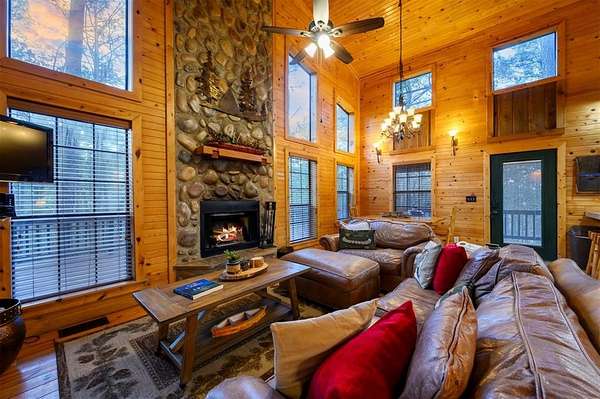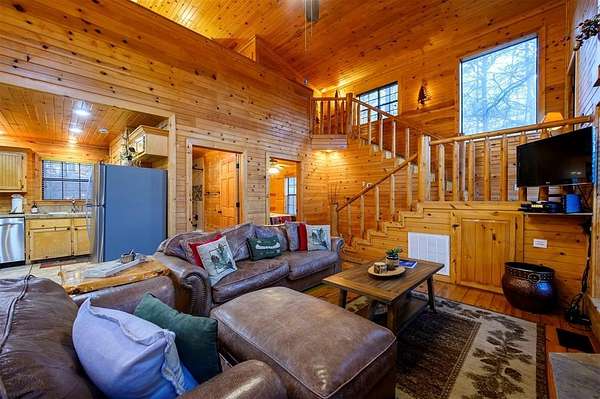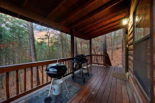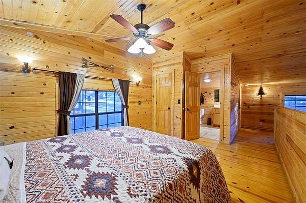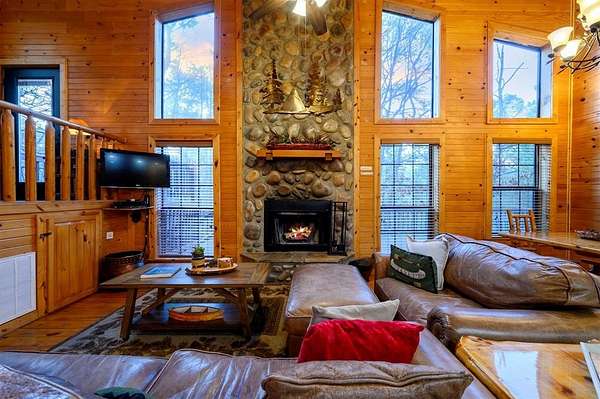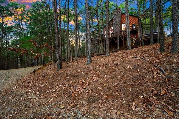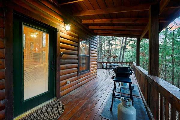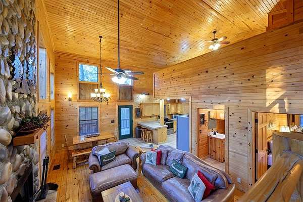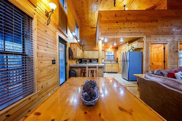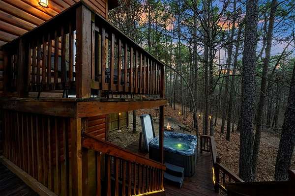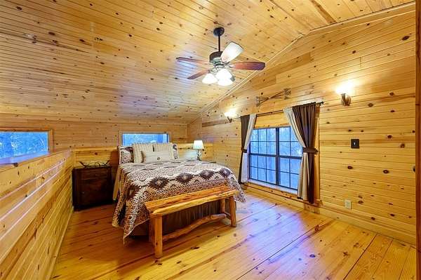 Tucked away on two gloriously secluded, wooded acres and overlooking a stocked pond in the private, deed-restricted Wildhorse Plantation, Spokane is the perfect family getaway or short term rental opportunity. This private two bedroom, two full bath log sided cabin boasts a light filled main living area with walls of windows, warm pine interiors, vaulted ceiling, and renovated bathrooms. The great room features a floor to ceiling stone, wood burning fireplace with custom made decor. The well equipped kitchen has tile countertops, breakfast bar, ample cabinetry and stainless steel appliances. A queen bedroom and bath with tiled tub/shower combination complete the first floor. Upstairs, a loft like second bedroom provides tree top views and a full bath with tiled shower services this bedroom. Covered and uncovered porches and decking allow for year round enjoyment of the outdoors and a fire pit and catch and release stocked pond provide hours of fun and relaxation for owners and guests alike. Spokane is located just off of 259A, minutes to the state park, Broken Bow Lake and all that Hochatown has to offer. Spokane has been well maintained and updated by the current owners and is offered fully furnished and equipped, including hot tub.