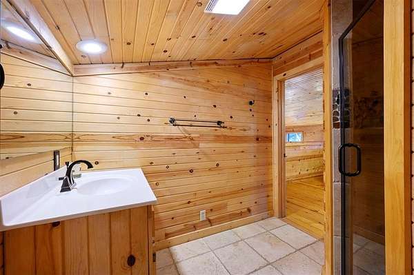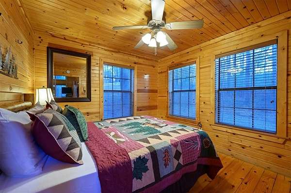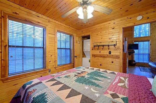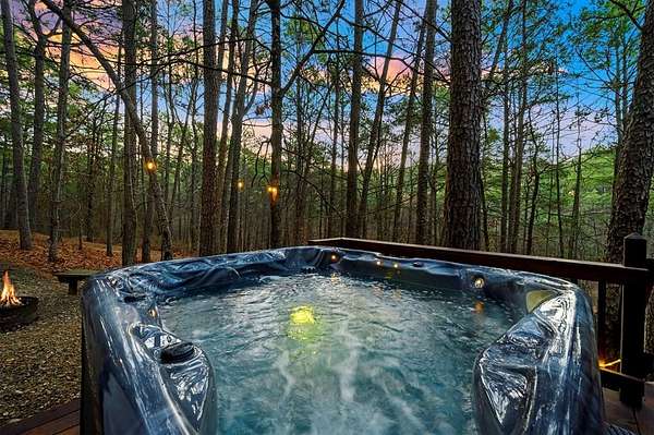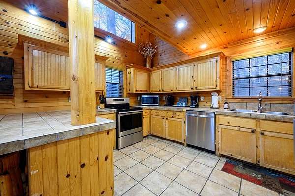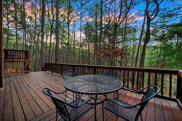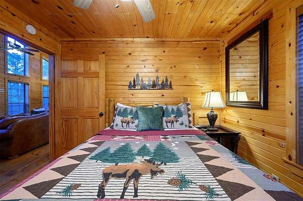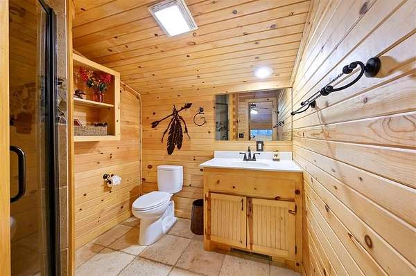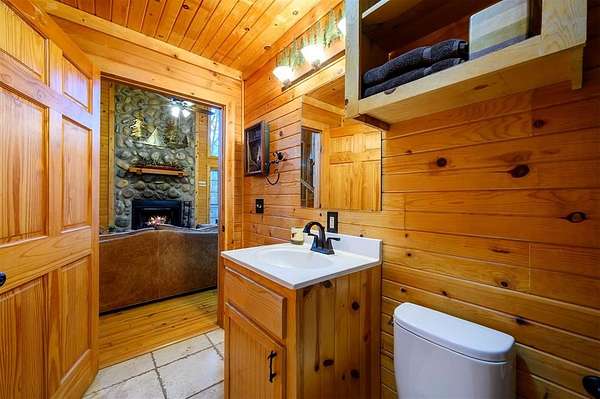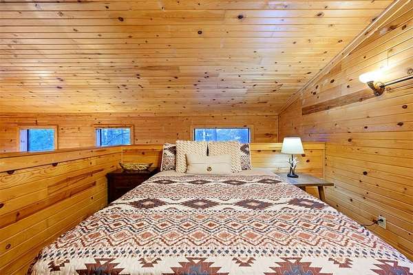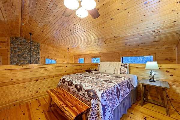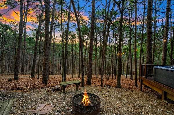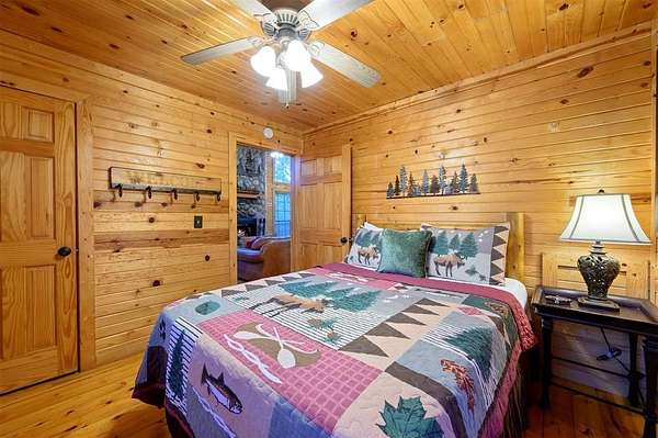 Tucked away on two gloriously secluded, wooded acres and overlooking a stocked pond in the private, deed-restricted Wildhorse Plantation, Spokane is the perfect family getaway or short term rental opportunity. This private two bedroom, two full bath log sided cabin boasts a light filled main living area with walls of windows, warm pine interiors, vaulted ceiling, and renovated bathrooms. The great room features a floor to ceiling stone, wood burning fireplace with custom made decor. The well equipped kitchen has tile countertops, breakfast bar, ample cabinetry and stainless steel appliances. A queen bedroom and bath with tiled tub/shower combination complete the first floor. Upstairs, a loft like second bedroom provides tree top views and a full bath with tiled shower services this bedroom. Covered and uncovered porches and decking allow for year round enjoyment of the outdoors and a fire pit and catch and release stocked pond provide hours of fun and relaxation for owners and guests alike. Spokane is located just off of 259A, minutes to the state park, Broken Bow Lake and all that Hochatown has to offer. Spokane has been well maintained and updated by the current owners and is offered fully furnished and equipped, including hot tub.
