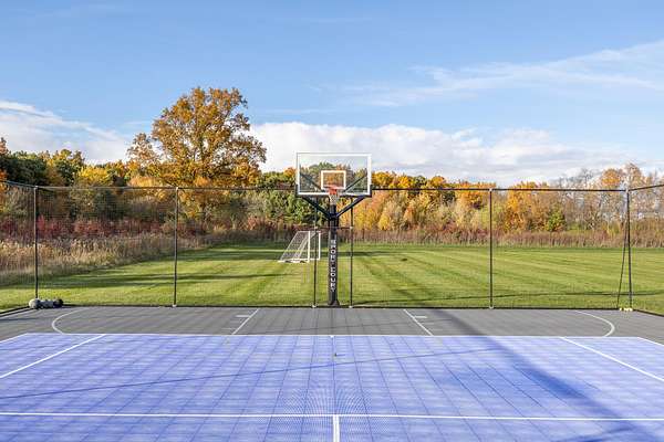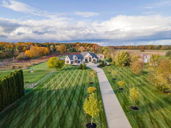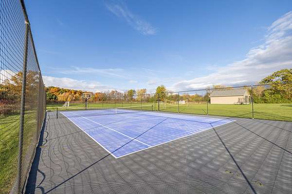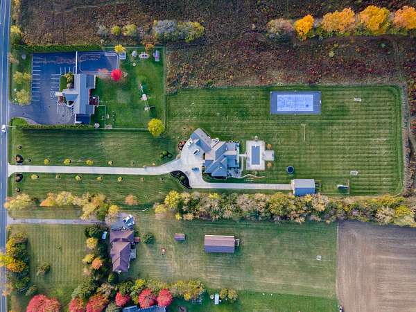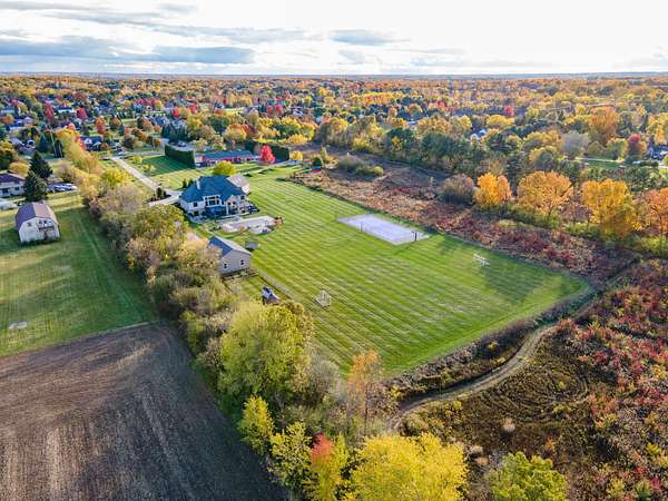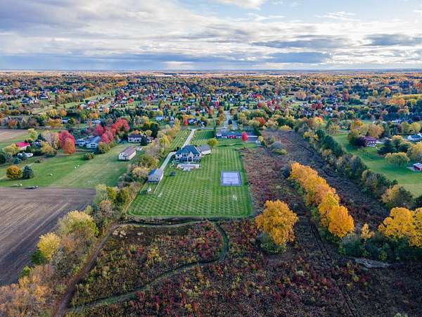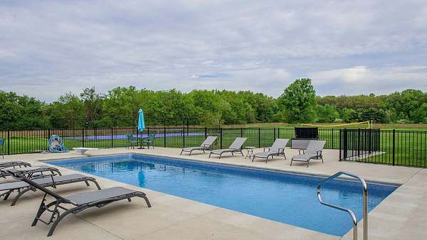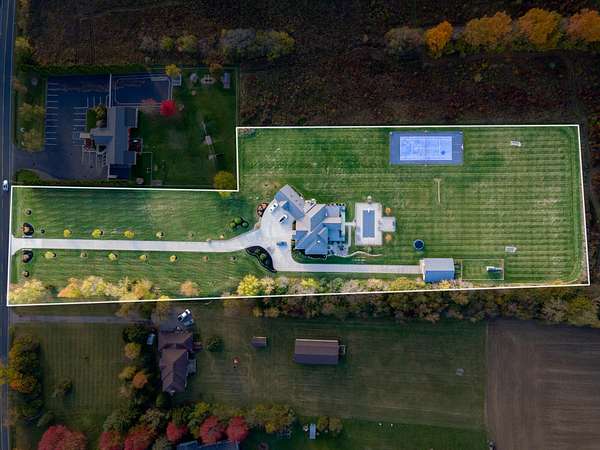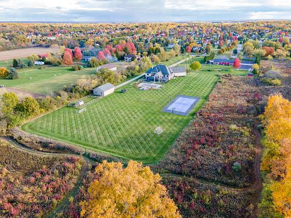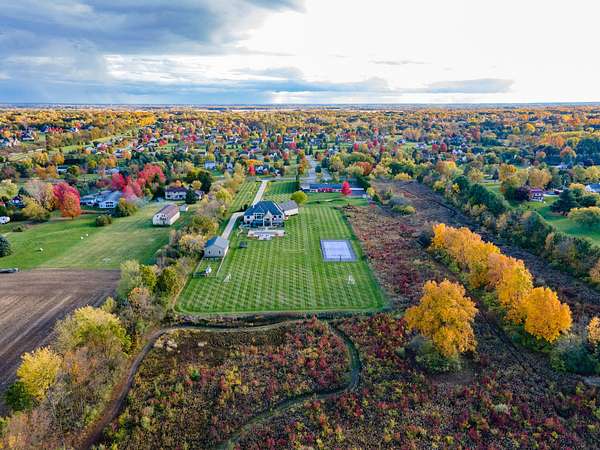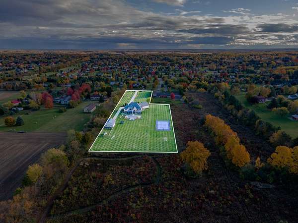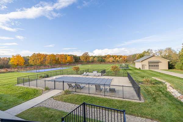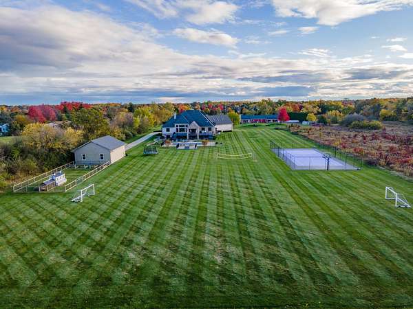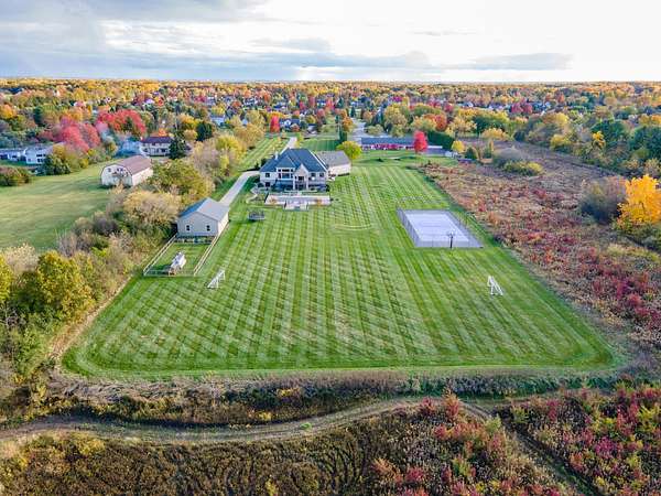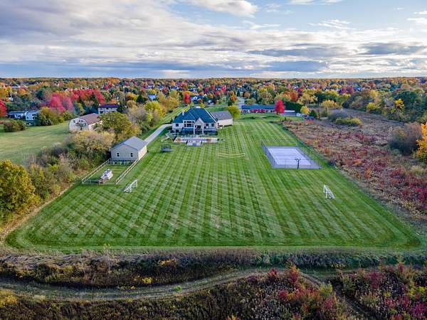 Welcome to your dream ranch estate-an extraordinary 6-bedroom, 4.5-bathroom masterpiece perfectly set on 5 acres of lush, wooded countryside within Saline Schools. This custom-built home was designed for those who crave both elegance and recreation, offering an unparalleled resort-style lifestyle. As you travel down the private, paved driveway, you'll be captivated by the beautifully landscaped grounds and the impressive curb appeal of this 8-year-old home. Step inside to find an expansive open-concept floor plan filled with natural light and showcasing exquisite craftsmanship at every turn. The heart of the home is the chef's kitchen, featuring a Wolf six-burner range, Sub-Zero refrigerator, oversized island with Corian countertops, custom cabinetry, and designer lighting. The kitchen opens seamlessly into the great room with beamed ceilings, a stunning floor-to-ceiling stone fireplace, and a wall of windows offering sweeping views of the backyard oasis. A formal dining room and private office flank the welcoming foyer, adding both sophistication and function. The primary suite enjoys its own private wing, and features a spa-like ensuite with European-style shower, soaking tub, dual vanities, and two walk-in closets. On the opposite wing, two additional bedrooms share a beautifully tiled Jack-and-Jill bath. Perfect for guests or extended family, the in-law suite above the garage includes a separate living room, bedroom, walk-in closet, and full bathroom. The finished walkout lower level is an entertainer's dream featuring a movie theater with tiered seating, recreation areas for pool and Foosball tables, a fitness space, two additional bedrooms, and a full bath. Step outside to your private resort, complete with a massive heated in-ground salt water pool with wave feature, lights, and fountain, surrounded by an expansive concrete patio, tennis court with basketball and pickle ball options, chicken coop, soccer field, and disc golf area. A large 30'x40' outbuilding provides additional storage for recreational vehicles and equipment, while the heated epoxy-floor three car garage adds luxury and convenience. Set back from the road for total privacy and peace, yet just minutes from downtown Saline and Ann Arbor, this estate offers the rare combination of refined living and outdoor adventure. Discover your own piece of paradise where every day feels like a vacation.