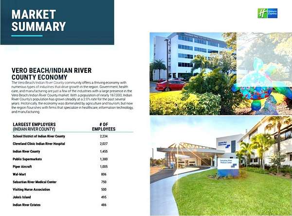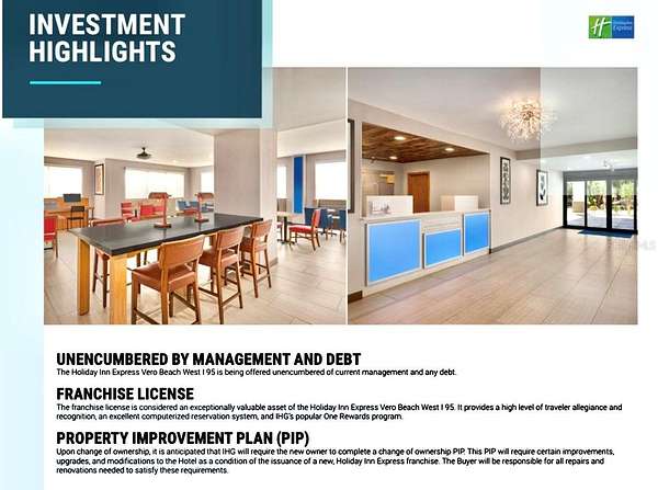 FOR SALE: High-Income Holiday Inn Motel - Prime Location in Vero Beach, FloridaAsking Price: $6,900,000Appraised Value: $8,300,000 (Verified)Loan Balance: $4,700,000 (Assumable)Cash Required to Close: Approximately $2,000,000Annual Revenue: $2,000,000+Rooms: 65 Premium Renovated RoomsPrice Per Room: $106,000Discount from Market Value: $1.4 MillionProperty OverviewThis is a rare opportunity to acquire a high-revenue Holiday Inn located directly on Interstate I-75, in the rapidly growing area of Vero Beach, Florida. Positioned right next to the Vero Beach Outlets, this motel enjoys outstanding visibility and heavy highway traffic, making it one of the most strategically located hospitality properties in the region.Key Features:65 Fully Renovated Premium Guest RoomsNewly upgraded and maintained to the highest standards. Excellent guest reviews and strong repeat business.Outstanding LocationFirst motel off I-75 at the Vero Beach Outlets - high traffic area with strong year-round demand.Strong Financial PerformanceGenerates over $2 million in verified annual revenue, with room to grow under experienced ownership.Excellent AmenitiesIncludes a large swimming pool, modern fitness center, and comfortable lounge area - appealing to both leisure and business travelers.Ample ParkingOver 70 dedicated parking spaces, ideal for guests with vehicles, RVs, or tour buses.Investment Highlights:Priced Below Market Value: Appraised at $8.3 million, available for just $6.9 million - offering immediate equity.Assumable Loan: Existing $4.7 million loan is assumable, minimizing the cash investment required.Only $2 Million Down: Acquire a high-performing asset with just $2 million out of pocket.Turnkey Operation: Professionally maintained, fully operational, and revenue-generating from day one.Who This Is Perfect For:Experienced hotel/motel operatorsInvestors seeking strong cash flow with real estate upsideBuyers using 1031 exchange fundsHospitality groups looking for a flagship Florida locationSummary:This is a unique chance to own a well-established, highly visible, and top-performing Holiday Inn in a premium Florida market -- with built-in equity and strong returns. Opportunities like this are rare in today's market.