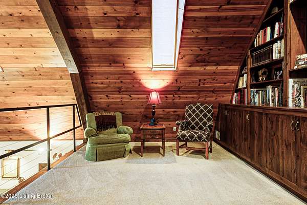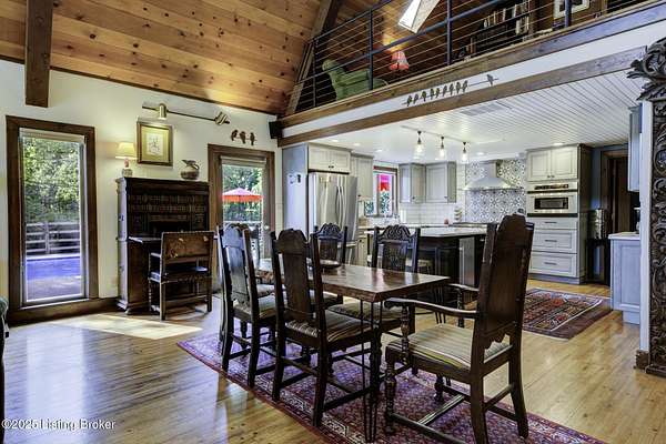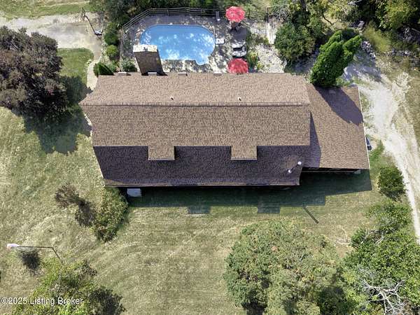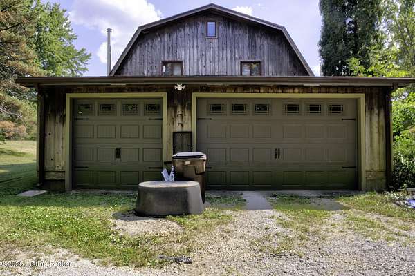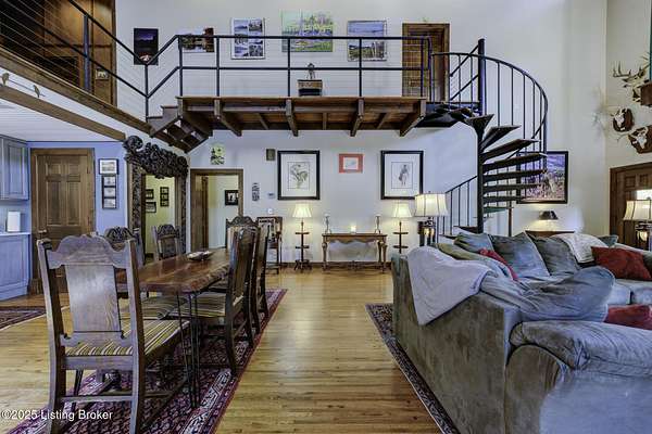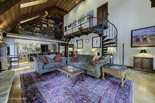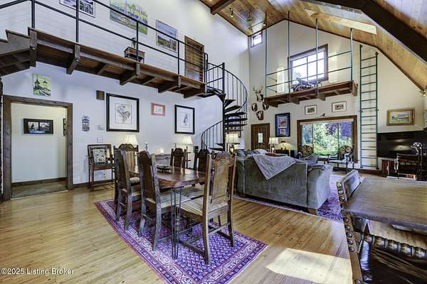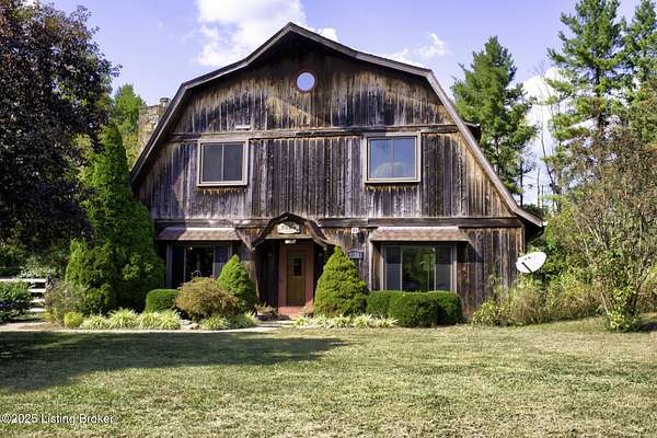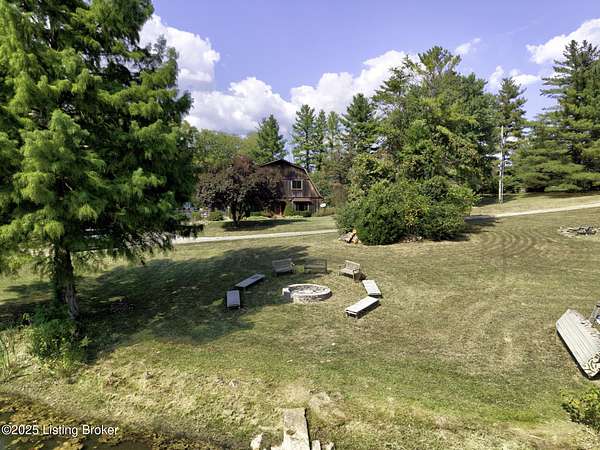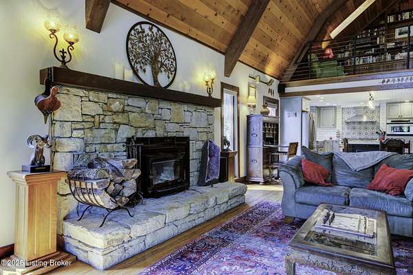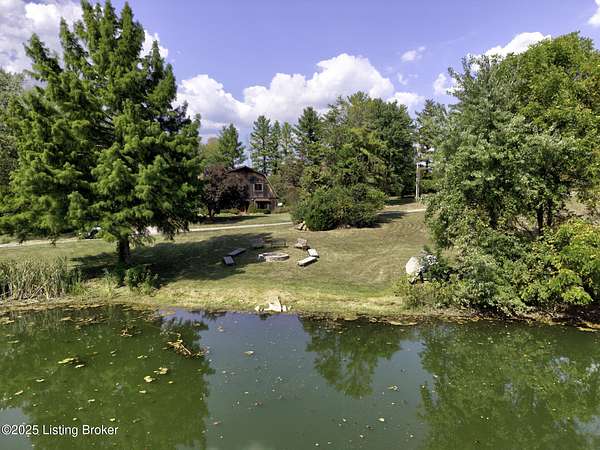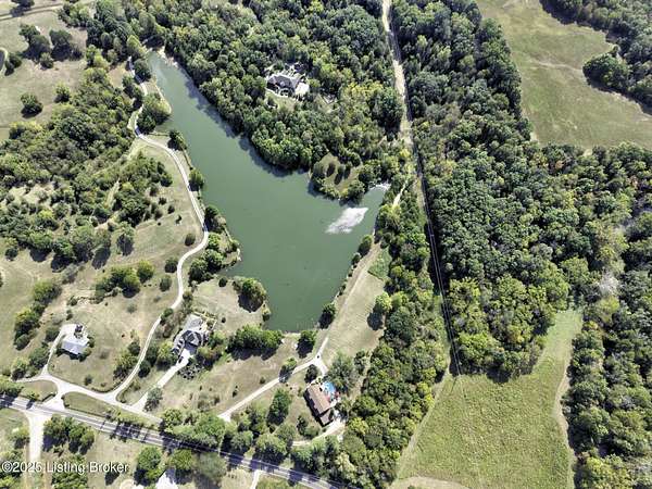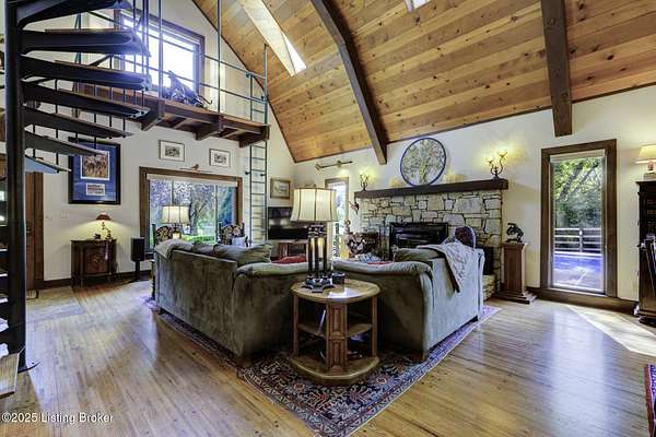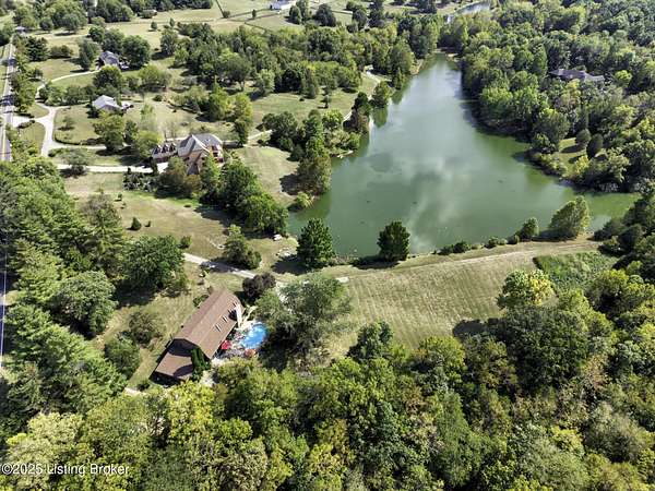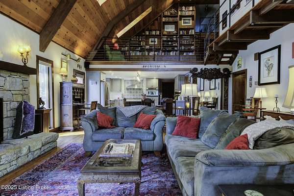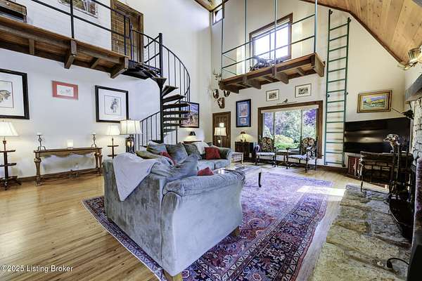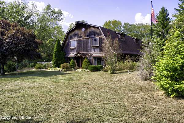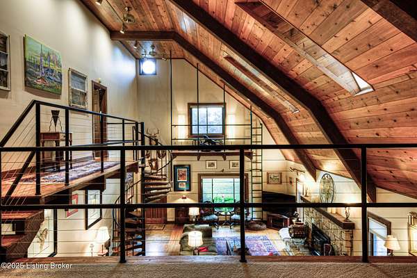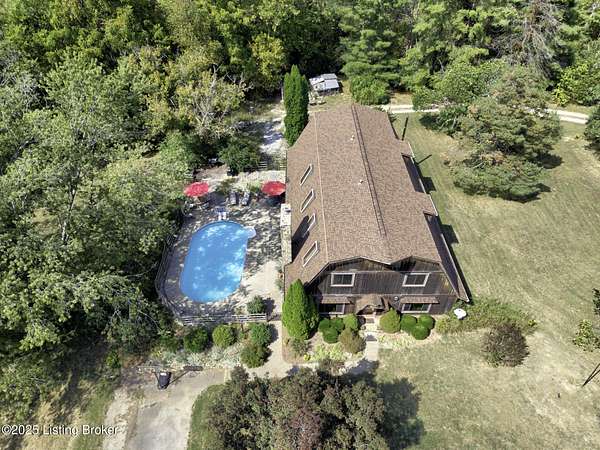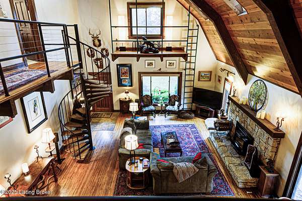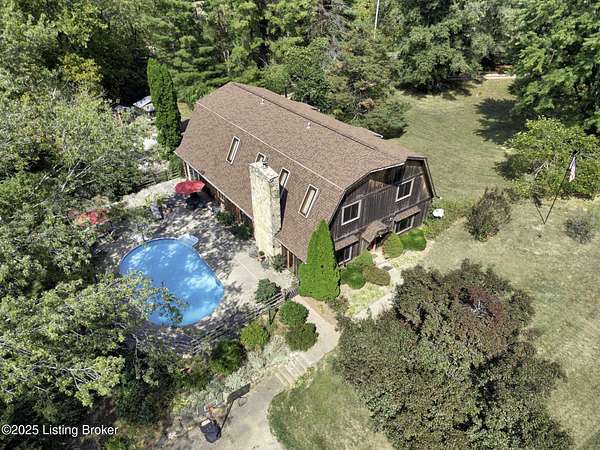 Known locally as The Barn, this Shelby County retreat was built as a family sanctuary. It carries a Louisville address in the highly sought-after 40245. Step inside and you'll feel more ski lodge than suburb-23' vaulted ceilings, a massive stone fireplace, and sawn oak floors reclaimed from refrigerated boxcars. A viewing platform anchors one end, while a lofted library overlooks the updated kitchen with stainless appliances and a 6-burner Wolf range. Past the kitchen, you'll find the dining room, full bath, bar, and recreation room with direct access to the pool and outdoor entertaining area. The bar top is a single red oak slab sourced from a Missouri farm, adding both warmth and history to the space. The first-floor primary suite includes a double vanity, jacuzzi tub, and walk-in shower. Up the spiral staircase, you'll discover three bedrooms, a one-of-a-kind 1 1/2 Jack-and-Jill bathroom, laundry room, office, and the library loft. A short ladder climb takes you to a bonus loft hangout. Outside, the pool and patio overlook a private lake and sprawling yard with a shooting range at the far end. An 8' wide custom fire pit sits lakeside, setting the stage for countless evenings and S'mores under the stars. Out front, a 7-acre lakestocked with bass and bluegillfaces southwest for unforgettable sunrises.