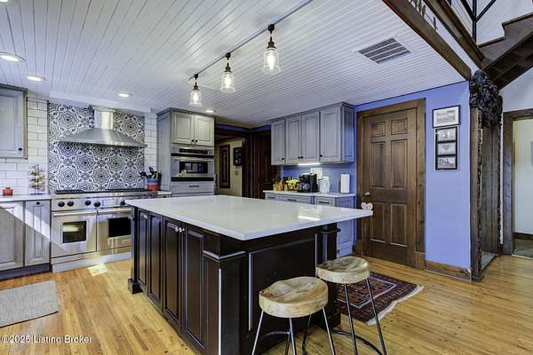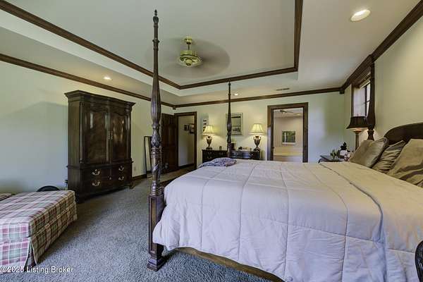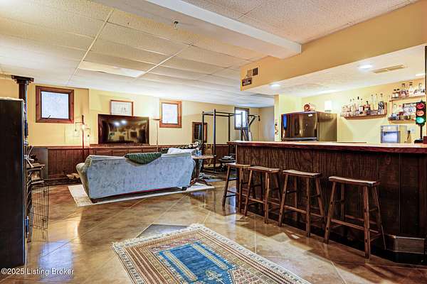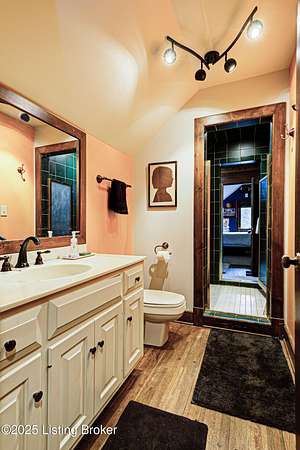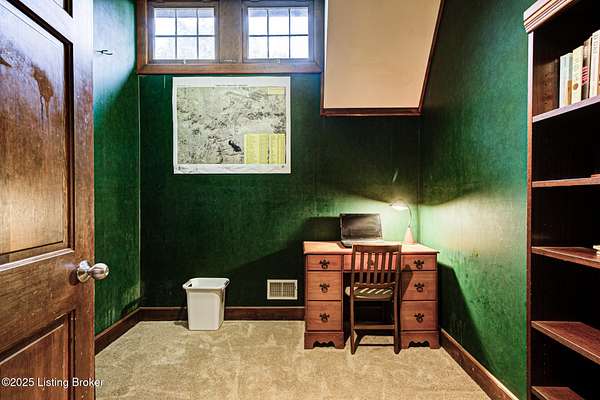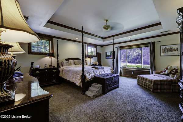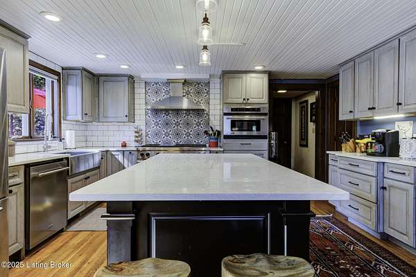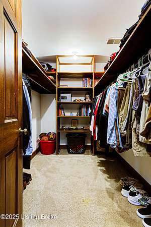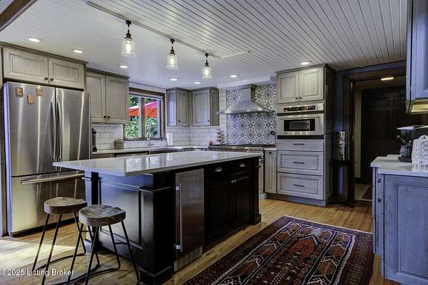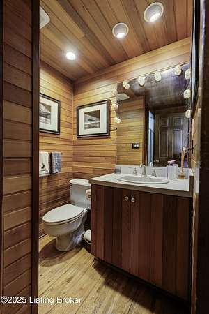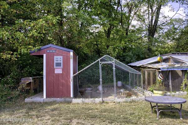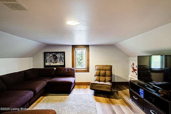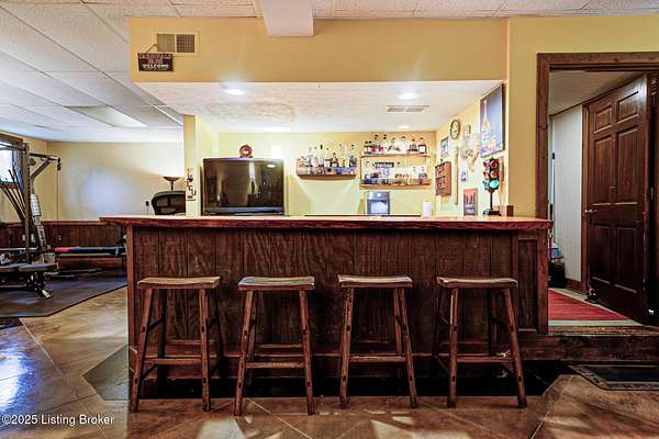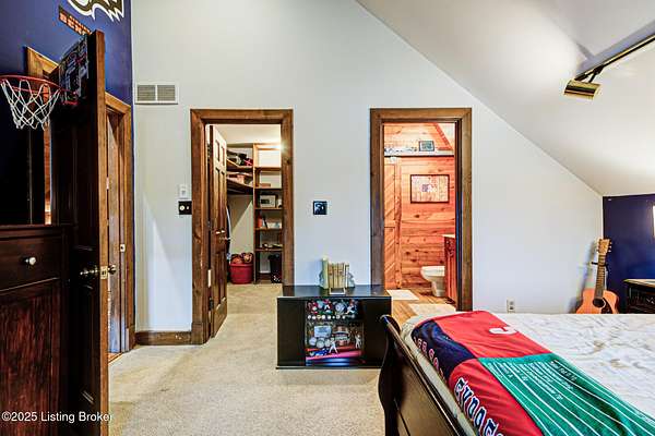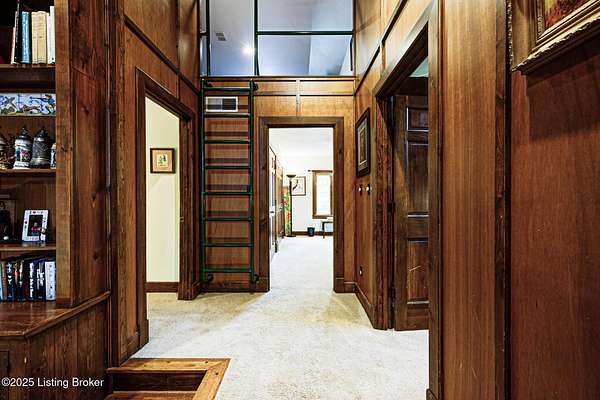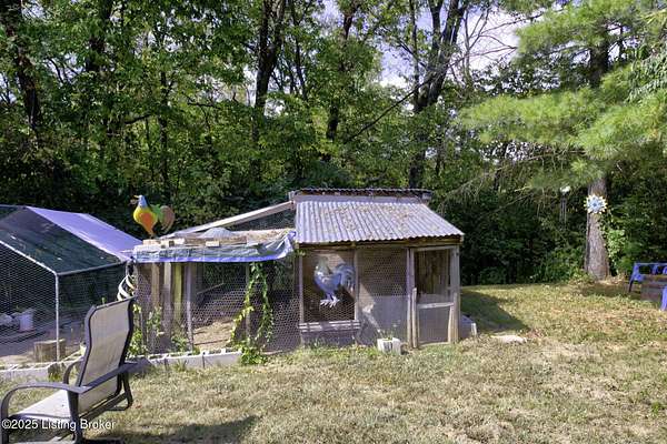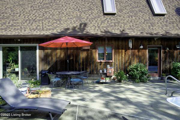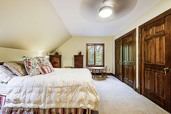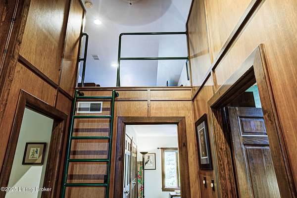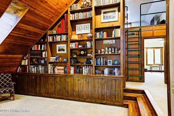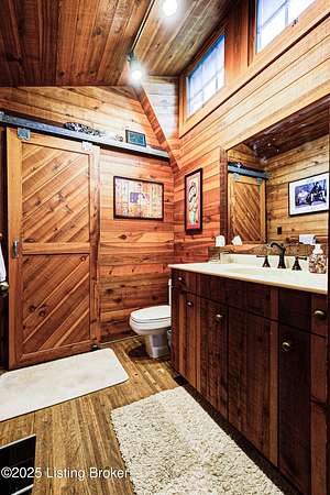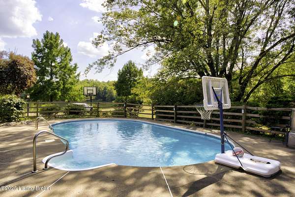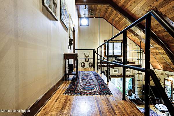 Known locally as The Barn, this Shelby County retreat was built as a family sanctuary. It carries a Louisville address in the highly sought-after 40245. Step inside and you'll feel more ski lodge than suburb-23' vaulted ceilings, a massive stone fireplace, and sawn oak floors reclaimed from refrigerated boxcars. A viewing platform anchors one end, while a lofted library overlooks the updated kitchen with stainless appliances and a 6-burner Wolf range. Past the kitchen, you'll find the dining room, full bath, bar, and recreation room with direct access to the pool and outdoor entertaining area. The bar top is a single red oak slab sourced from a Missouri farm, adding both warmth and history to the space. The first-floor primary suite includes a double vanity, jacuzzi tub, and walk-in shower. Up the spiral staircase, you'll discover three bedrooms, a one-of-a-kind 1 1/2 Jack-and-Jill bathroom, laundry room, office, and the library loft. A short ladder climb takes you to a bonus loft hangout. Outside, the pool and patio overlook a private lake and sprawling yard with a shooting range at the far end. An 8' wide custom fire pit sits lakeside, setting the stage for countless evenings and S'mores under the stars. Out front, a 7-acre lakestocked with bass and bluegillfaces southwest for unforgettable sunrises.
