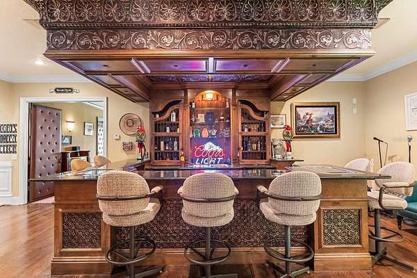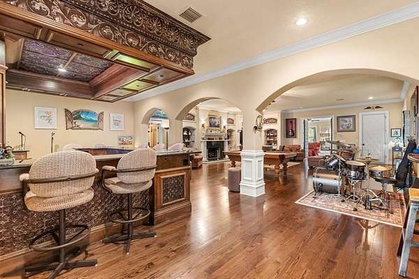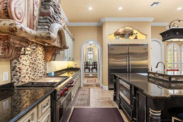 - Built-In Features, Cathedral Ceiling(s), Ceiling Fans(s), Central Vaccum, Coffered Ceiling(s), Crown Molding, Eat-In Kitchen, Elevator, High Ceilings, Kitchen/Family Room Combo, Primary Bedroom Main Floor, Primary Bedroom Upstairs, Solid Wood Cabinets, Split Bedroom, Stone Counters, Thermostat, Tray Ceiling(s), Walk-In Closet(s), Wet Bar, Window Treatments