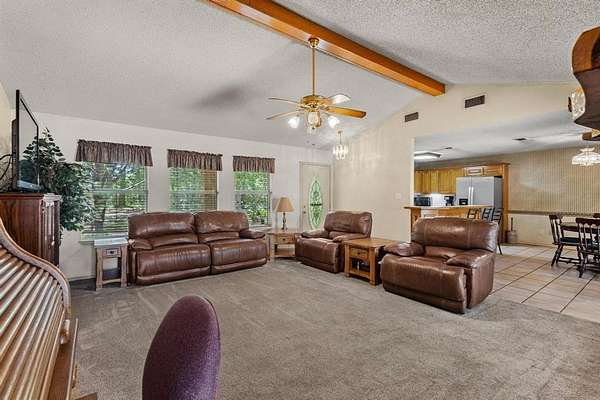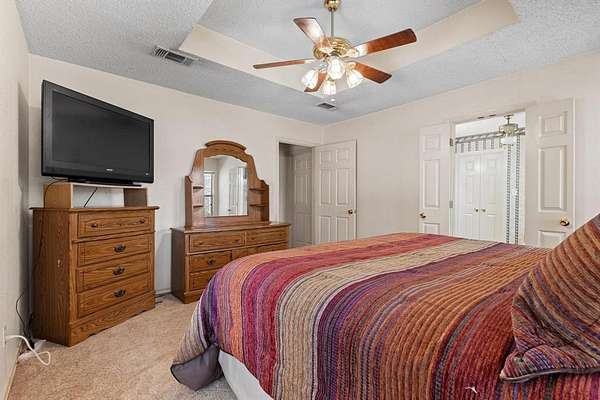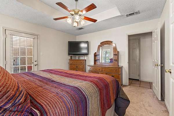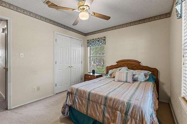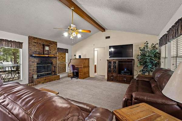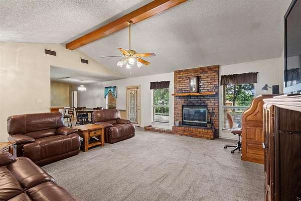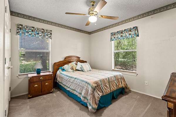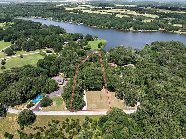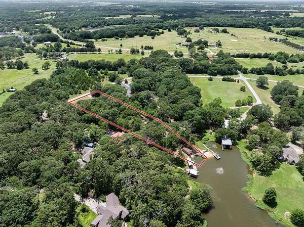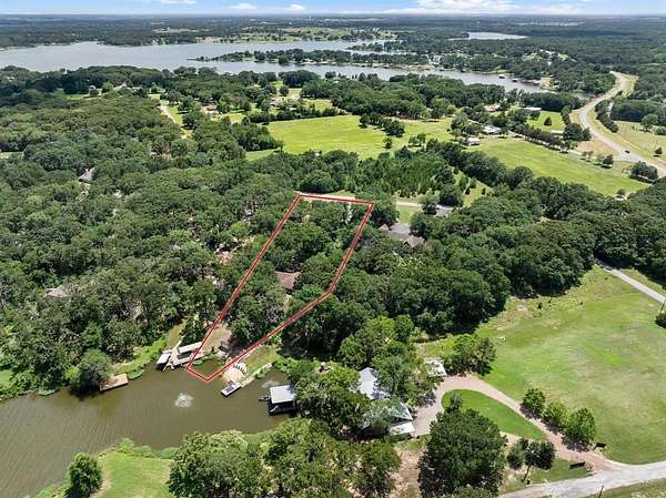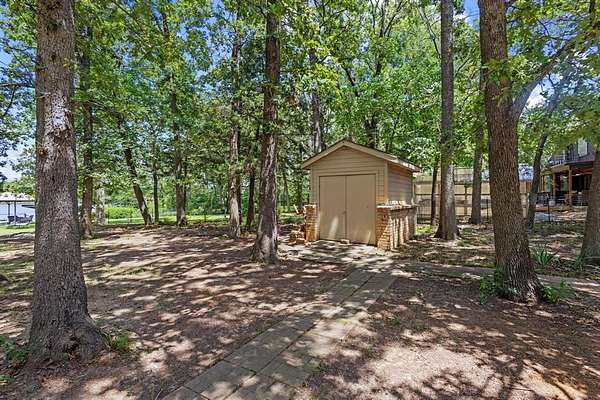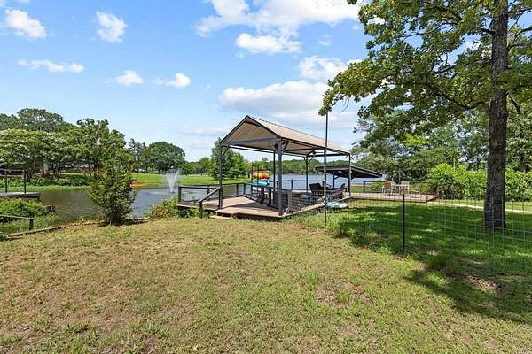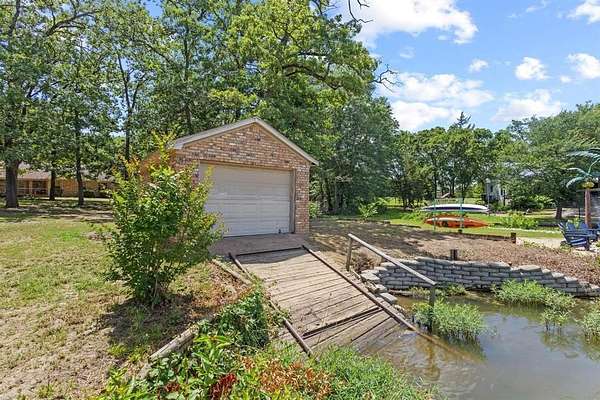 3 bedroom, 2 bath, 2 car garage, brick home with water frontage and lots of shade trees. Home has an open floor plan, a wood burning fireplace, a breakfast bar and vaulted ceilings. The primary bedroom is split from the other bedrooms has views of the lake and has a large closet with built-in shelves, a jetted tub, walk-in shower, and double sinks. Outside there is a small garden shed, a patio, circle driveway and a brick boat house that has a boat ramp with direct access to the water. There is also a shared covered patio by the water for fishing or relaxing. Come take a look at this opportunity to own a home on the well established Bonham Lake where boating, skiing, fishing are swimming are allowed. There is a 99 year lease on the lot with the City of Bonham.