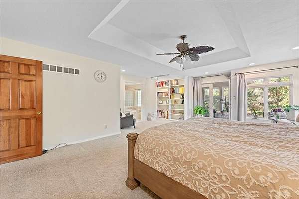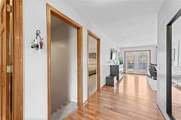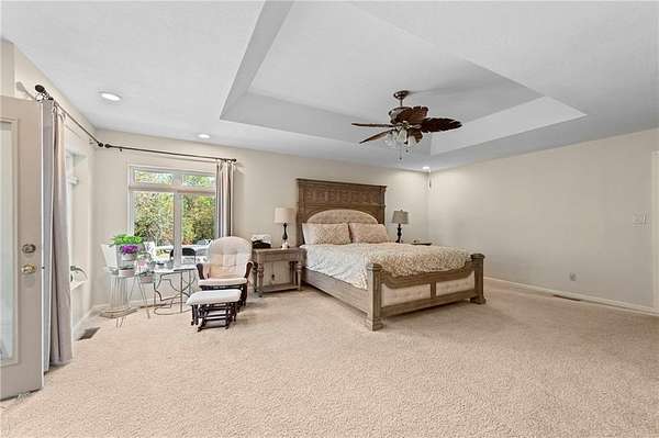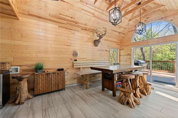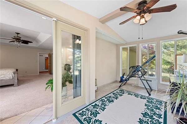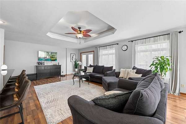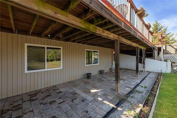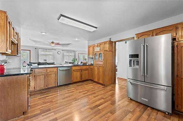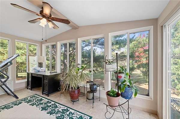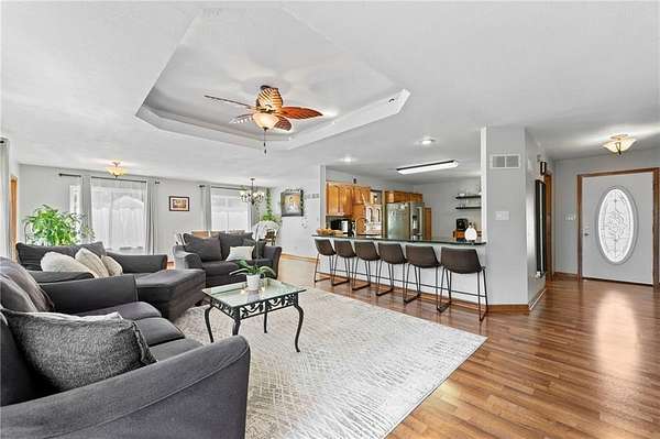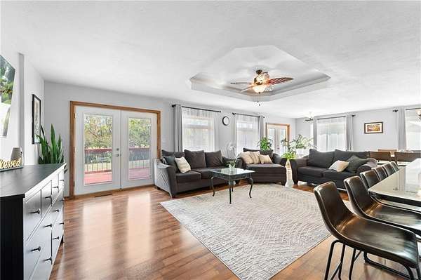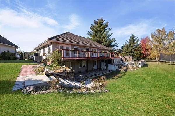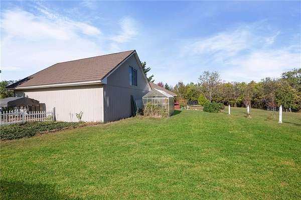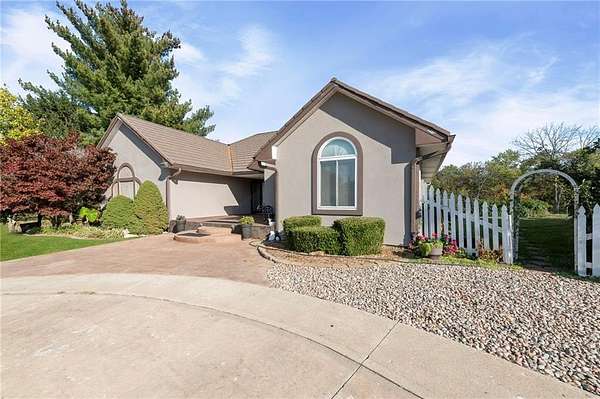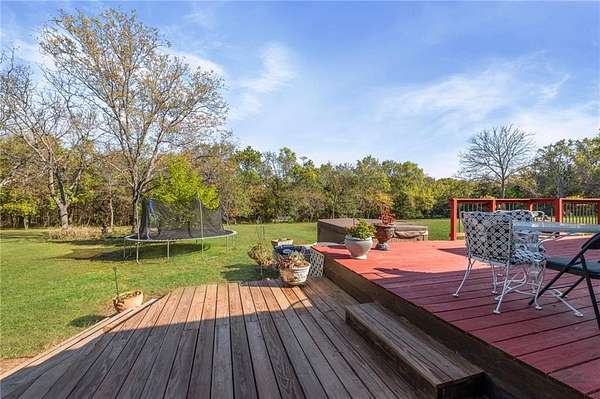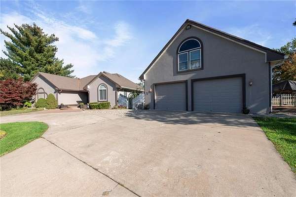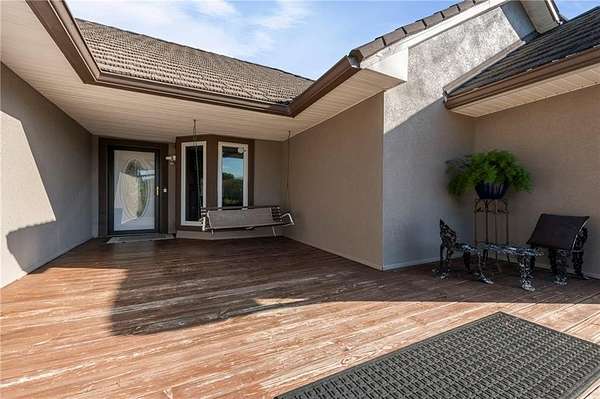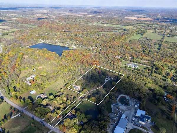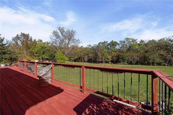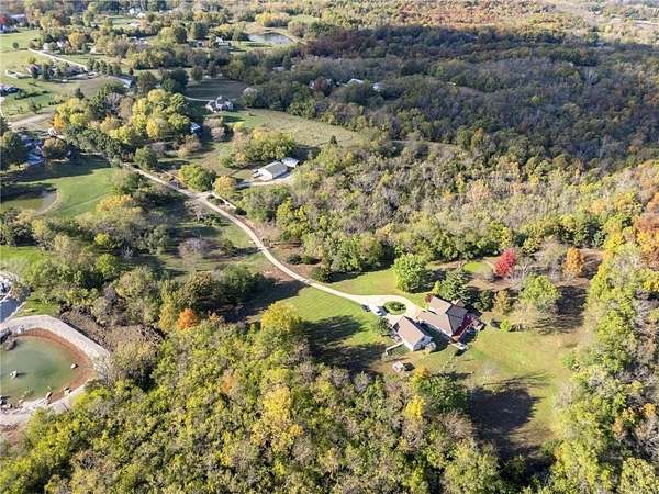 Discover your secluded dream estate nestled at the end of a long, winding driveway on a sprawling 10.22-acre lot, this Ranch-style residence offers a private sanctuary with the freedom of country living. The spacious interior on the main level features 3 bedrooms and 3 bathrooms with a thoughtful layout, including a combination living and dining room, and an eat-in kitchen with a breakfast nook. Enjoy the convenience of a main-level laundry room off of the primary bedroom and a sunroom. The finished walk-out basement expands your living options including 3 bedrooms and 2 bathrooms and a wet bar area. Enjoy the unique property amenities featuring a dedicated sauna for relaxation and a workshop perfect for car enthusiasts or hobbyists. Outside, the stucco-exterior home features a welcoming front porch, and a deck overlooking your acreage. The property is partially fenced where you have the freedom to enjoy your extensive land to its fullest. This property is a rare find, offering space, luxury, and privacy in a peaceful setting only 30 miles from downtown kansas city.