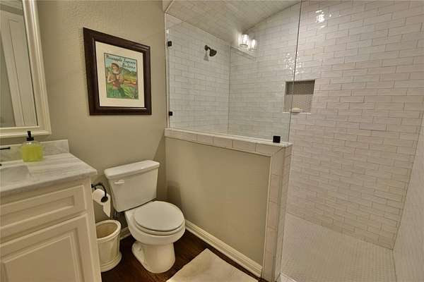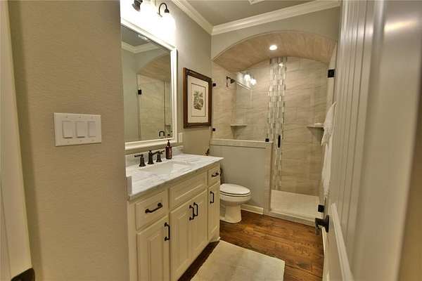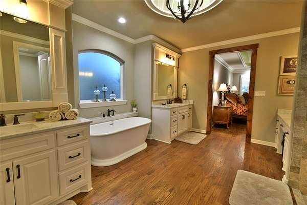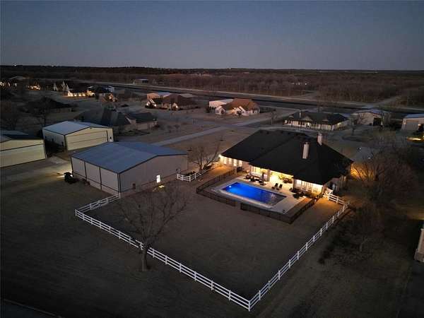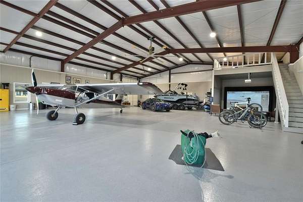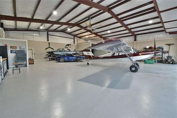 Better-than-new, full custom home located in the highly desired The Landings Airpark (FAA Identifier 66TE). This thoughtfully designed residence offers an open-concept layout with hand-scraped, nail-down hardwood flooring throughout and no carpet or tile. Architectural details include high-beam ceilings, 8 ft doors, hand-troweled walls, and extensive trim and crown molding. Double French doors open to both the front sitting porch and the rear patio, creating comfortable indoor-outdoor flow. Additional features include plantation shutters throughout, solid wood custom barn doors at the office and primary suite, dovetail soft-close drawers, and granite and marble countertops throughout the home. Major upgrades include a 1-year-old Class 4 roof, dual upgraded Trane HVAC systems, a ventless gas fireplace with auto-light log set, and an extra-deep 4-car garage with custom insulated doors. The kitchen is well equipped with stainless KitchenAid appliances, a 48 inch Wolf rangetop with griddle, pot filler, apron sink, and a remote-controlled range hood, along with a large pantry, butler's pantry with wine cooler, and extensive cabinetry and storage. The oversized primary suite features a Dutch vaulted ceiling, a spacious custom bath with dome ceiling, and a finished walk-in closet. Bathrooms include four walk-in showers, three of which are doorless, with tile extending from floor to barrel ceiling. Outdoor living is highlighted by an 18x38 PebbleTec saltwater pool, Intelli-Connect controlled, surrounded by an oversized patio with outdoor kitchen, wood-burning gas fireplace, motorized retractable screens, and polyurea-coated flooring, providing a comfortable space for everyday use and entertaining. The 60x60 hangar offers excellent utility with a 54 ft Higher Power door, polyurea-coated floors, 14 ft Big Ass fan, 12 ft high siding with loft storage, a bathroom, 50-amp RV plug, and an RV door, making it suitable for aircraft storage, RV use, or additional workspace.