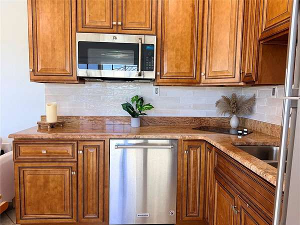 Inside, the 384 sq ft Grande Suite is exceptionally well appointed. The spacious kitchenette is a standout feature, offering granite countertops, a full-size refrigerator, full-size dishwasher, built-in induction cooktop, and a convection/microwave combination. Abundant cabinetry includes smart storage solutions such as a lazy Susan and pull-out spice rack. The suite also features a full bathroom with walk-in shower and glass doors, plus washer and dryer and a water softener for added convenience.